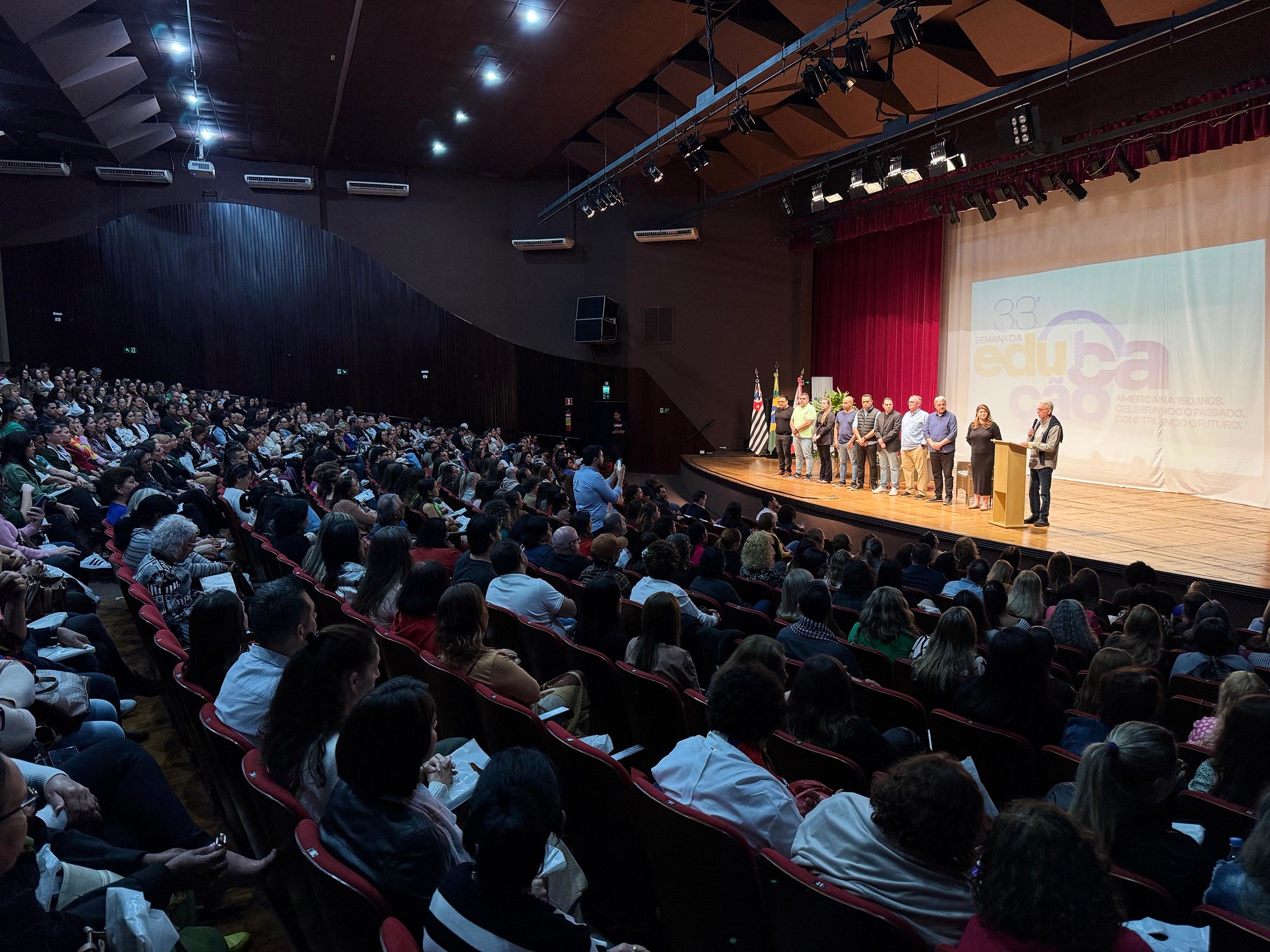 O prefeito de Americana, Chico Sardelli, ao lado do vice-prefeito Odir Demarchi e do secretário de Educação Vinicius Ghizini, abriu, na noite desta terça-feira (22), a 33ª Semana da Educação de Americana, que traz o tema “Americana 150 anos: Celebrando o passado, construindo o futuro”. O evento formativo organizado pela Prefeitura de Americana, por meio da Secretaria de Educação, acontece até sexta-feira (25) no Teatro Municipal Lulu Benencase, com o objetivo de qualificar o ensino por meio de palestras e apresentações culturais.