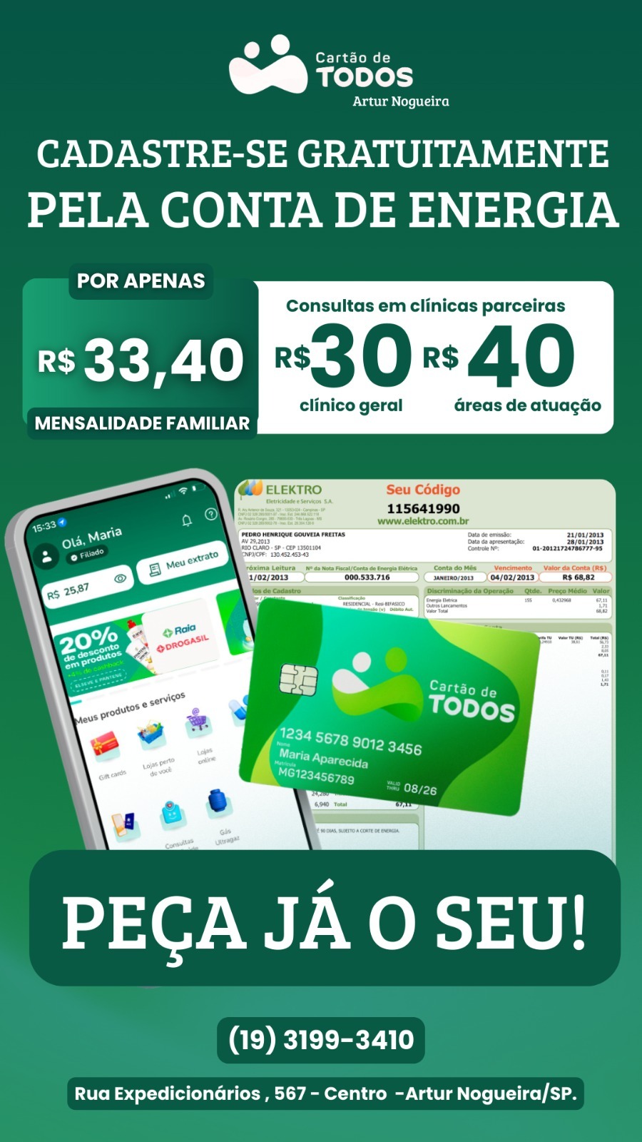 Cuidar da saúde, da família e ainda manter as contas organizadas pode ser um desafio na rotina. Pensando nisso, o Cartão de TODOS de Artur Nogueira anunciou uma novidade que facilita ainda mais a vida dos filiados: agora é possível pagar a mensalidade diretamente pela conta de energia elétrica, por meio de uma parceria com a Elektro.