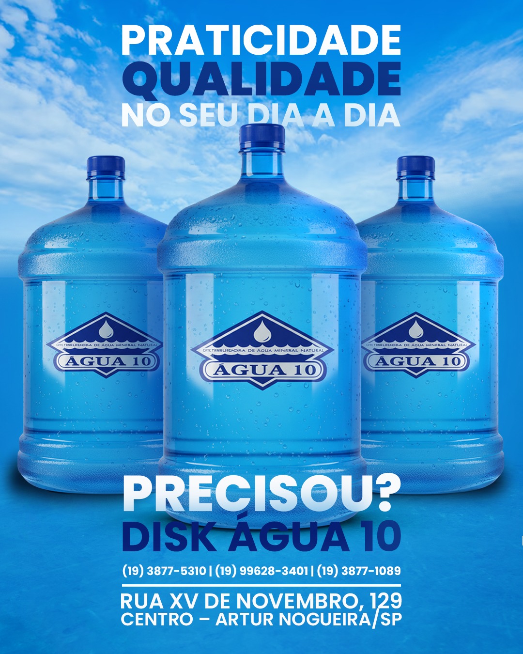 A Água 10 está localizada na Rua XV de Novembro, 129 – Centro – Artur Nogueira/SP. O horário de atendimento acontece de segunda a sexta das 8h às 18h. E aos sábados das 8h às 12h30. Entre em contato e faça o seu pedido via ligação ou WhatsApp nos seguintes números: (19) 3877-5310 – 38771089 ou (19) 9 9628-3401.