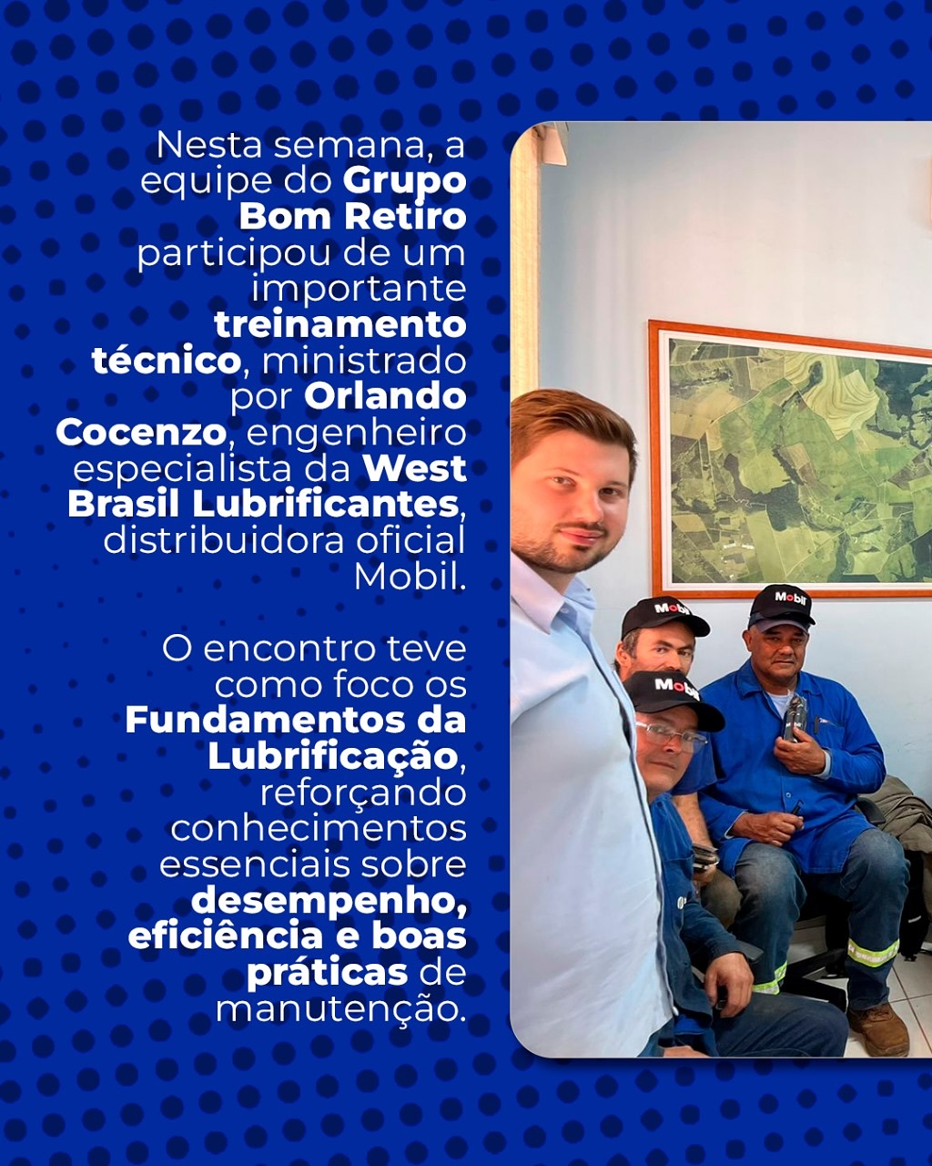 Nesta semana, colaboradores participaram do treinamento “Fundamentos da Lubrificação”, conduzido por Orlando Cocenzo, engenheiro técnico da West Brasil Lubrificantes, distribuidora oficial Mobil uma referência em soluções de alto desempenho para o agronegócio e a indústria.
