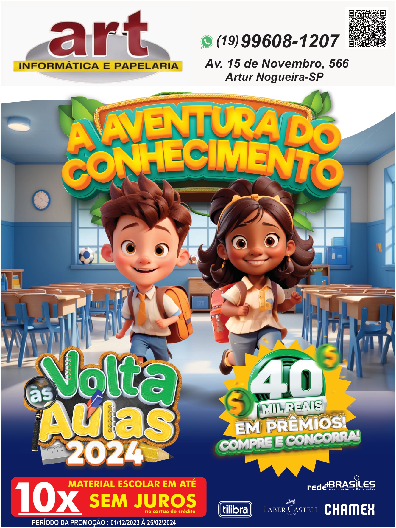 Para voltar às aulas ainda mais especial a Art Informática e Papelaria que é membro associado da Associação de Papelaria Rede Mais Brasiles (www.redemaisbrasiles.com.br) está participando de uma Promoção Especial de Volta às Aulas: “A Aventura do Conhecimento”. Durante o período de 01 de dezembro de 2023 a 25 de fevereiro de 2024, cada compra realizada na loja oferece a chance de concorrer a 40 mil reais em prêmios, sendo 1 prêmio de R$ 10.000,00 e mais 10 prêmios de R$ 3.000,00.
