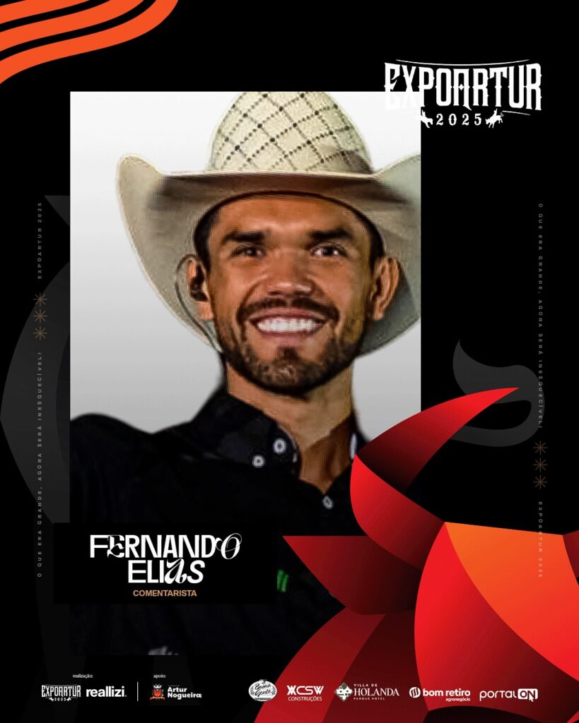Fernando Elias — Comentarista de rodeio há mais de 15 anos, soma mais de 400 eventos em seu currículo. Fernando alia informação e emoção na medida certa, trazendo uma leitura precisa das montarias e um olhar apaixonado pelo esporte.