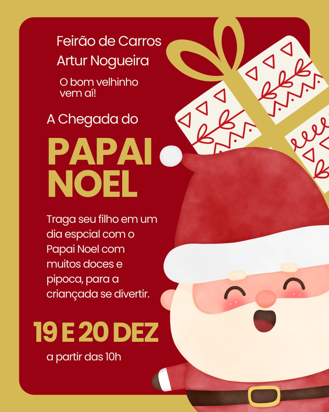 Durante os dois dias de evento, o Feirão de Carros se transforma em um espaço de convivência e celebração. As crianças poderão se divertir com a presença do Papai Noel, além da distribuição de doces, pipoca e momentos de interação pensados especialmente para elas. A proposta é proporcionar uma experiência leve, alegre e familiar, convidando pais e filhos a aproveitarem juntos esse momento especial de fim de ano.