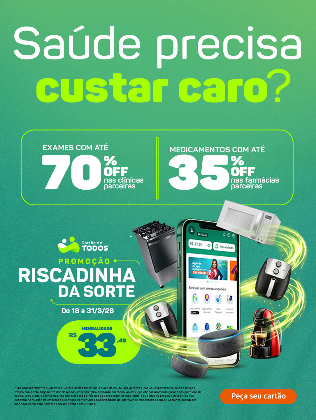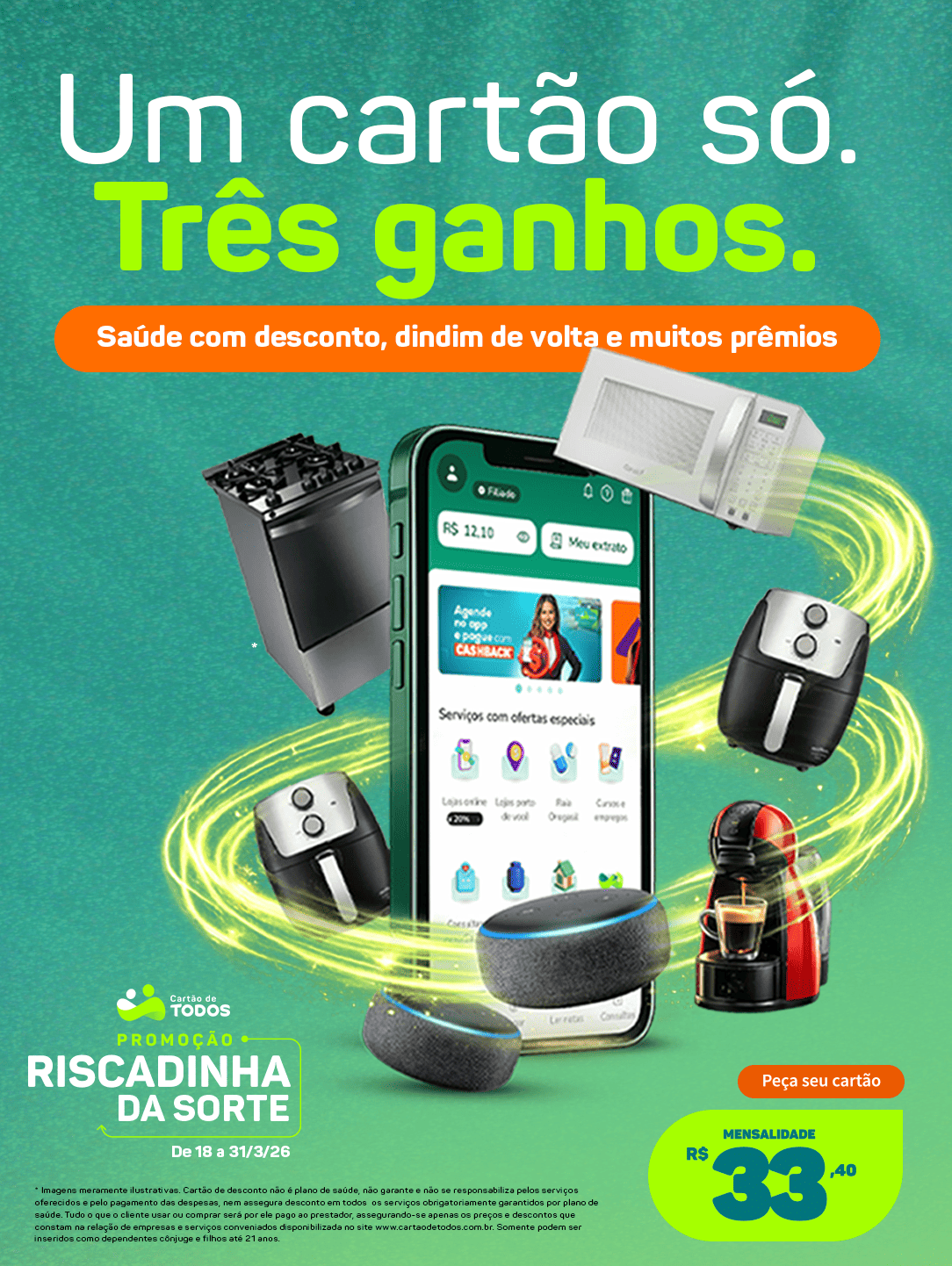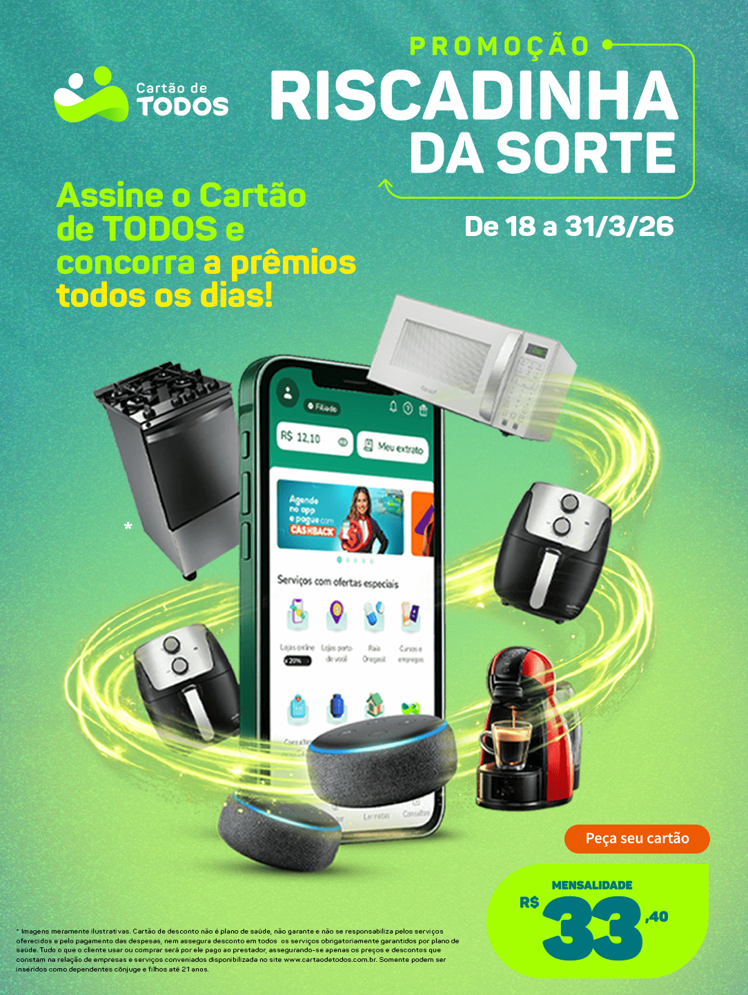 Além de concorrer na promoção, o filiado do Cartão de TODOS conta com uma mensalidade acessível de R$ 33,40 e acesso a uma vasta rede de descontos em saúde, educação e lazer, além de serviços com ofertas especiais e cashback em parceiros como a Drogasil.