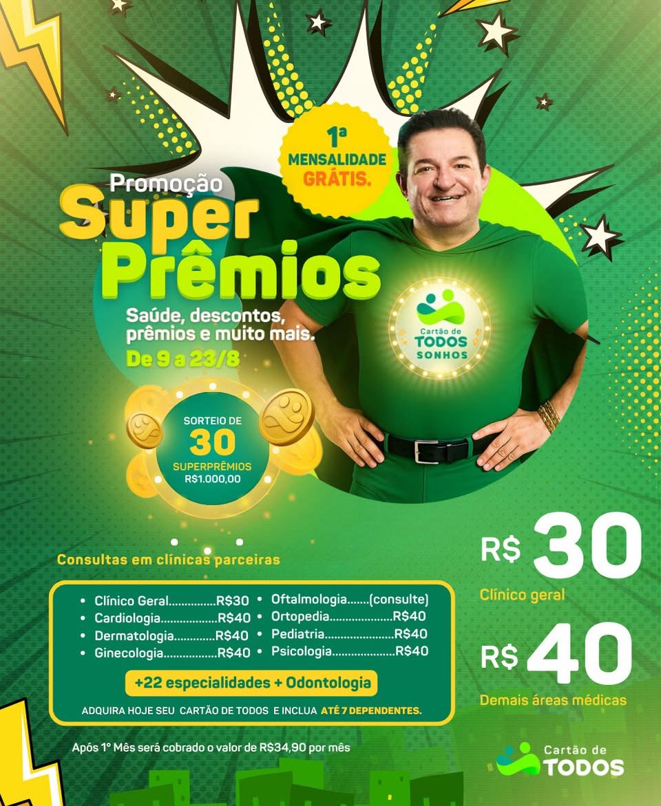 Até o dia 23 de agosto, quem fizer o Cartão de TODOS paga apenas R$ 34,90 na adesão (valor que já inclui o título de capitalização) e garante o primeiro mês totalmente grátis. É a oportunidade perfeita para começar a cuidar da sua saúde e economizar, sem sentir no bolso logo de início.