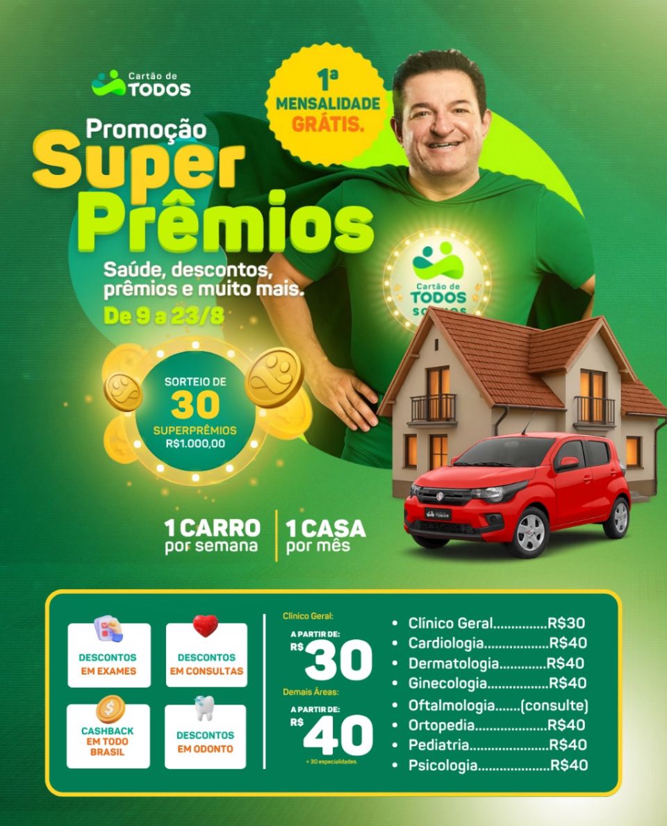 Ao fazer o seu Cartão de TODOS agora, você entra automaticamente na promoção Super Prêmios, com sorteios que vão muito além de descontos. São 30 prêmios de R$ 1.000, 1 carro toda semana e 1 casa todo mês. É a sua chance de melhorar de vida de forma rápida e real.