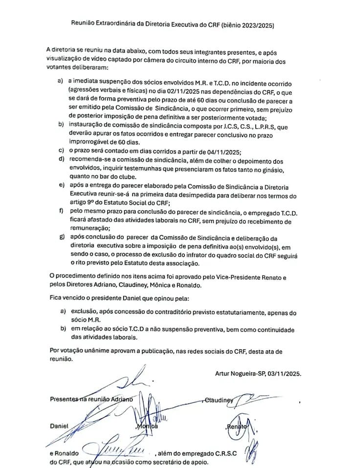 a) a imediata suspenção dos sócios envolvidos M.R. e T.C.D. no incidente ocorrido (agressões verbais e físicas) no dia 02/11/2025 nas dependências do CRF, o que se dará de forma preventiva pelo prazo de até 60 dias ou conclusão de parecer a ser emitido pela Comissão de Sindicância, o que ocorrer primeiro, sem prejuizo de posterior imposição de pena definitiva a ser posteriormente votada;