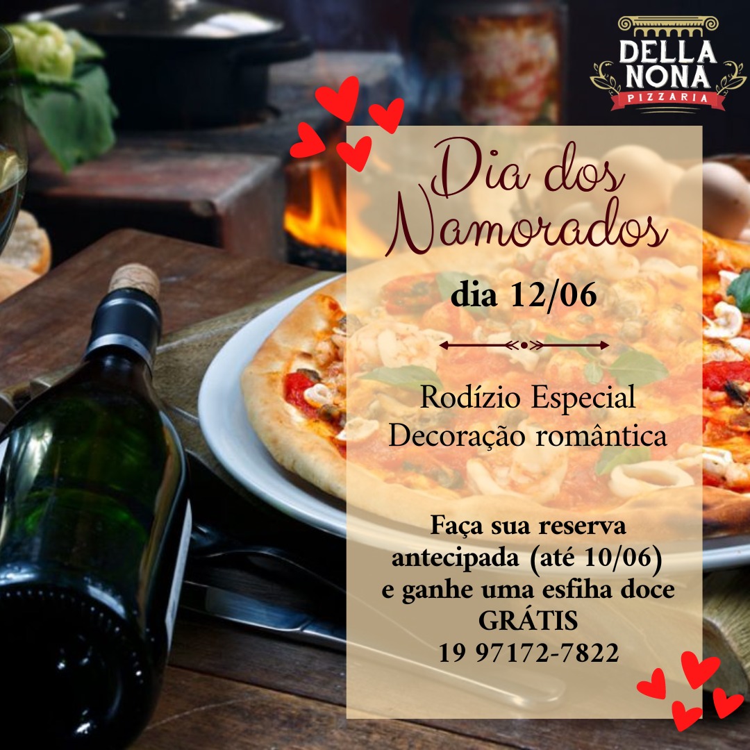 O clima de amor e romance está no ar na Della Nona Pizzaria. O Dia dos Namorados está chegando e você e seu amor precisam curtir e se deliciar com uma bela refeição para comemorar, não é mesmo?