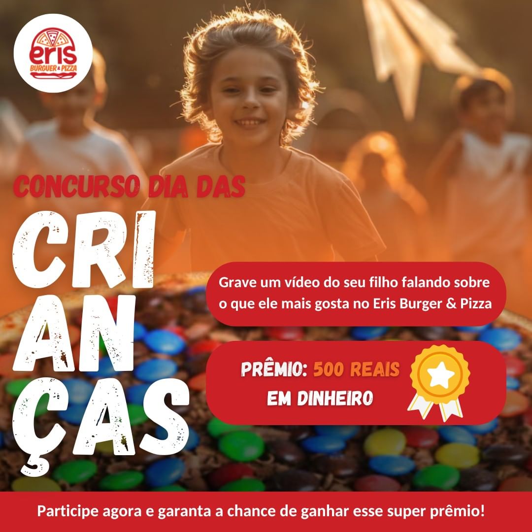 O Dia das Crianças está chegando e o Eris Burguer e Pizza preparou uma surpresa incrível para os pequenos! Para celebrar essa data tão especial, o Eris está promovendo um concurso com um prêmio de R$ 500 para para o vídeo mais engajado. O valor pode ser recebido via pix ou em consumo na lanchonete! Você é quem escolhe!