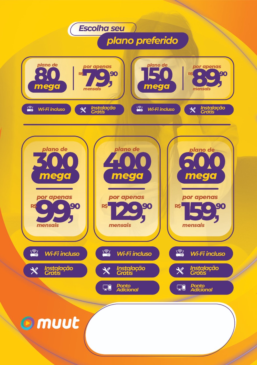 A Muut é responsável por uma internet estável e ultra veloz para você aproveitar o melhor da web com muito mais conectividade. Planos fibra de 40 até 600 mega de velocidade para atender a todas as suas necessidades de conexão.