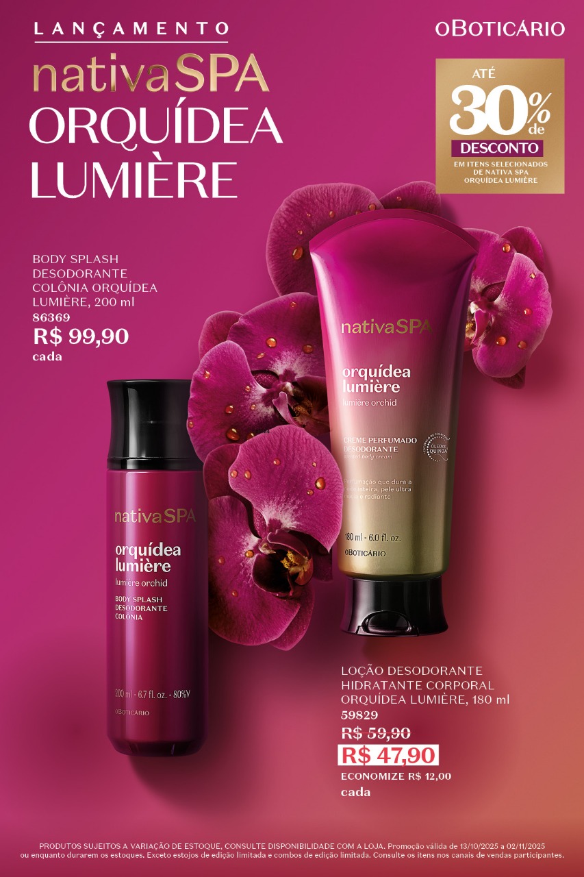 A linha Nativa SPA Orquídea Lumière traz uma perfumação sofisticada e duradoura, combinando o toque floral da orquídea com o brilho do Óleo de Quinoa, ingrediente reconhecido por seu alto poder nutritivo e hidratante. Composta por loção hidratante, óleo corporal, sabonete líquido, body splash e creme perfumado, a coleção oferece hidratação intensa e pele visivelmente mais macia, iluminada e radiante.