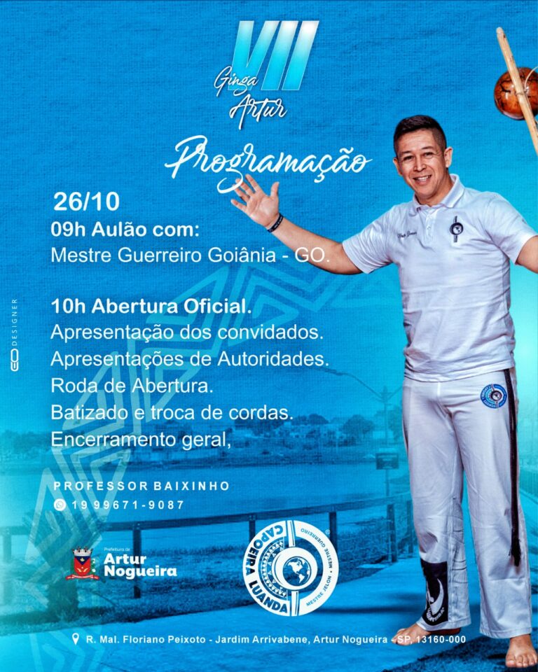 O Projeto de Capoeira “Luanda”, com o apoio das Secretarias de Cultura e de Esporte e Lazer, realiza neste domingo (26), a sétima edição do Festival Ginga Artur. O evento acontece às 09h, no Ginásio de Esporte Maurício Sia. A programação contará com a presença de diferentes mestres e instrutores de várias partes do Brasil. O festival se tornou um grande evento e referência na região, atraindo público de diversos locais.