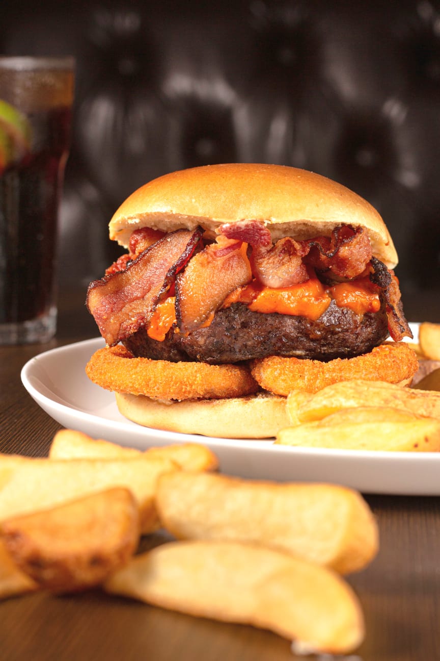 - Blues Burger: Pão de hambúrguer, robusto blend de carne bovina 250g, cheddar, cream cheese, bacon de pernil crocante, anéis de cebola empanados e molho especial.