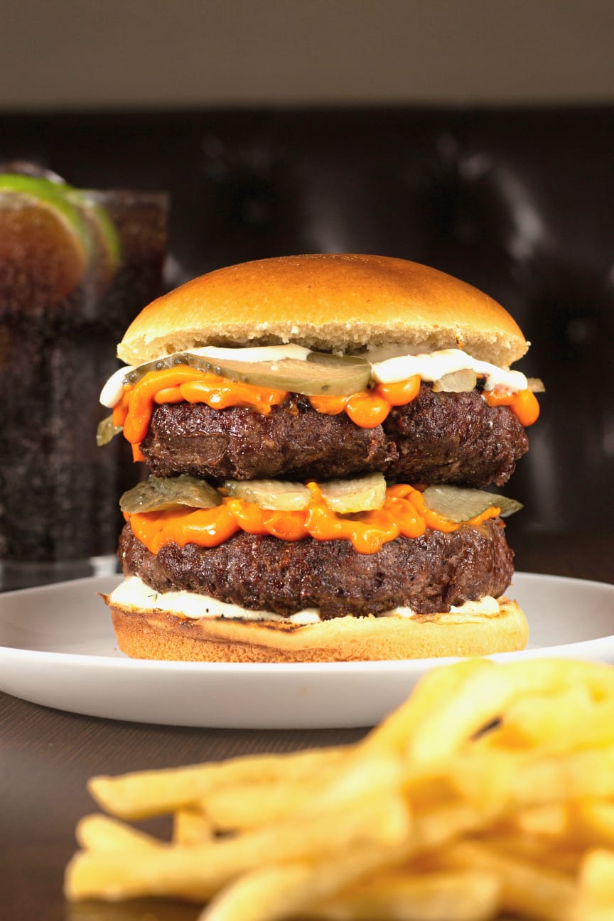 - Lounger Burger: Pão brioche, blend misto de proteínas vegetais 115g, mussarela vegana, alface, tomate e molho especial.