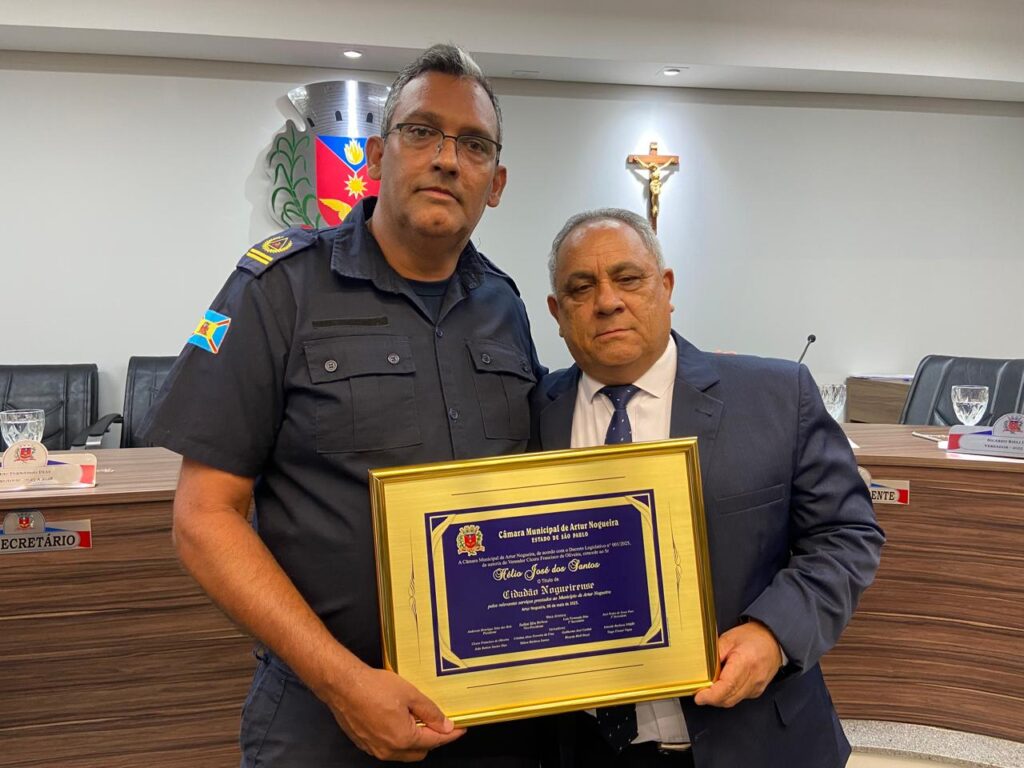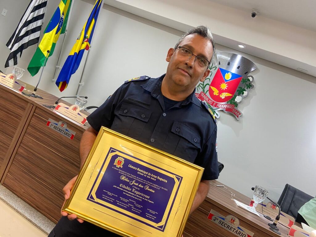 O Guarda Municipal de Artur Nogueira, Hélio José dos Santos, recebeu o título de Cidadão Nogueirense em uma cerimônia especial realizada na noite desta segunda-feira (6), na Câmara de Vereadores. A homenagem, proposta pelo vereador Cicinho, foi aprovada por unanimidade pelos parlamentares.