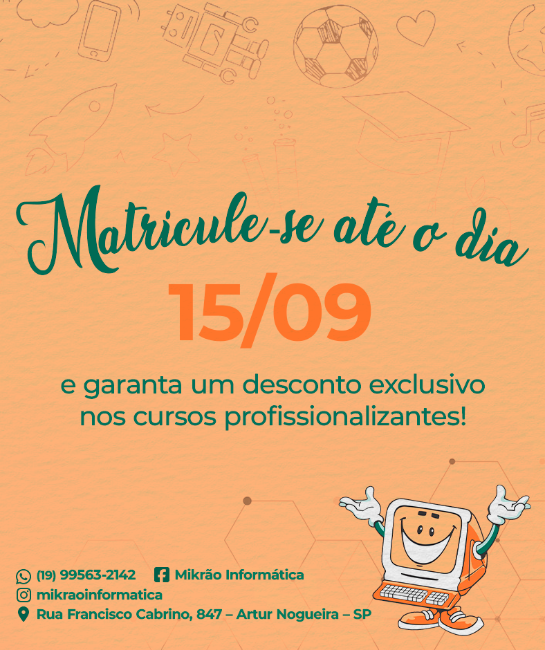 Para celebrar o Dia do Consumidor, no dia 15 de setembro, a Mikrão Informática preparou uma promoção especial. Alunos que se matricularem até essa data terão um desconto exclusivo nos cursos. Esta é a oportunidade perfeita para investir em sua formação com um custo-benefício incomparável.
