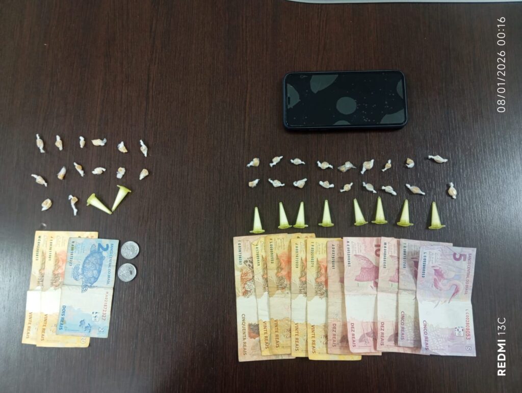 Durante a abordagem, com um dos rapazes foram encontrados, no bolso traseiro direito, dois pinos de cocaína e um invólucro contendo 14 pedras de crack, além de R$ 43 em dinheiro. Com a jovem, foram localizados um aparelho celular e R$ 80. Com o terceiro indivíduo, nada de ilícito foi encontrado.