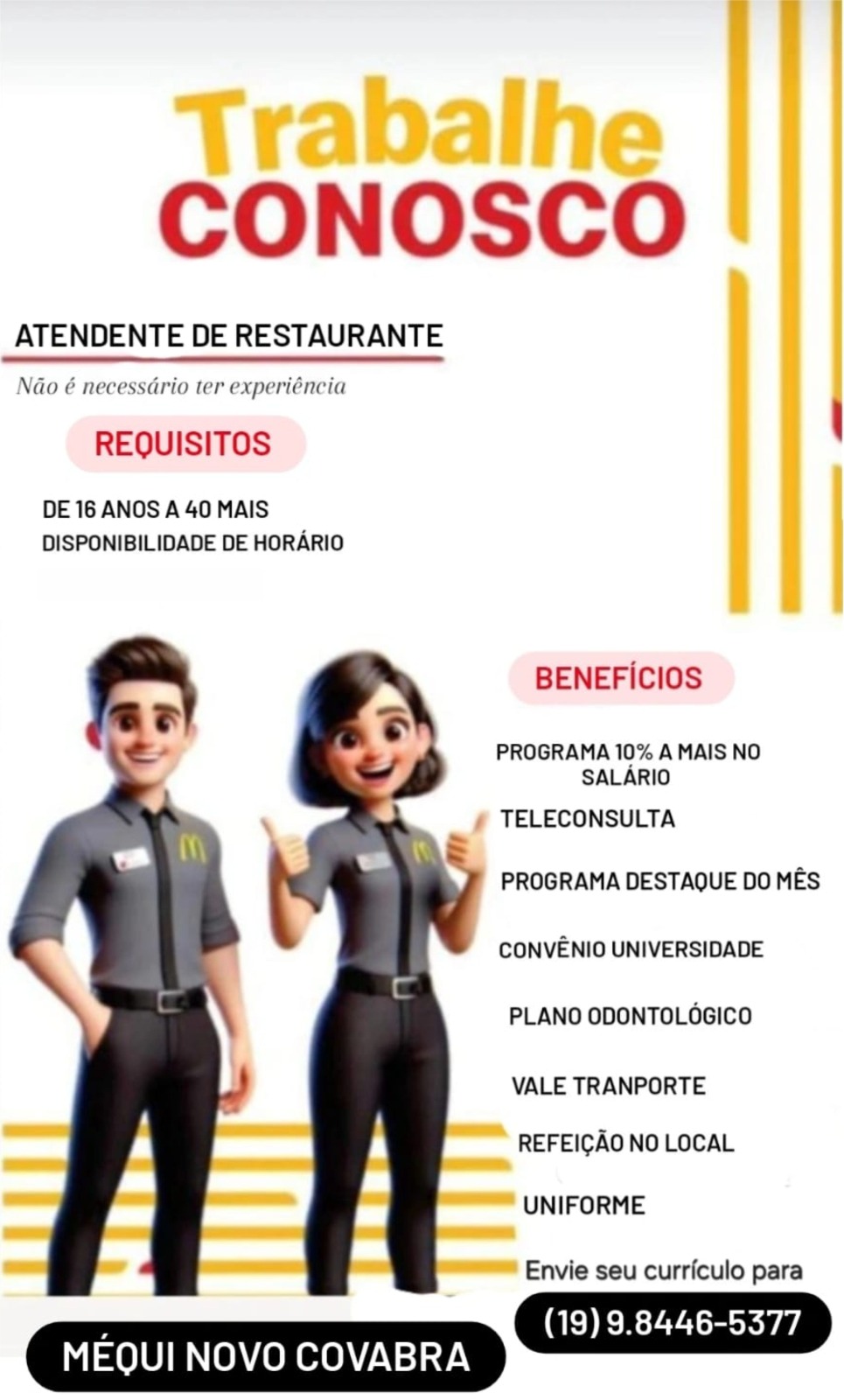 Méqui Novo Covabra abre vaga para Atendente de Restaurante