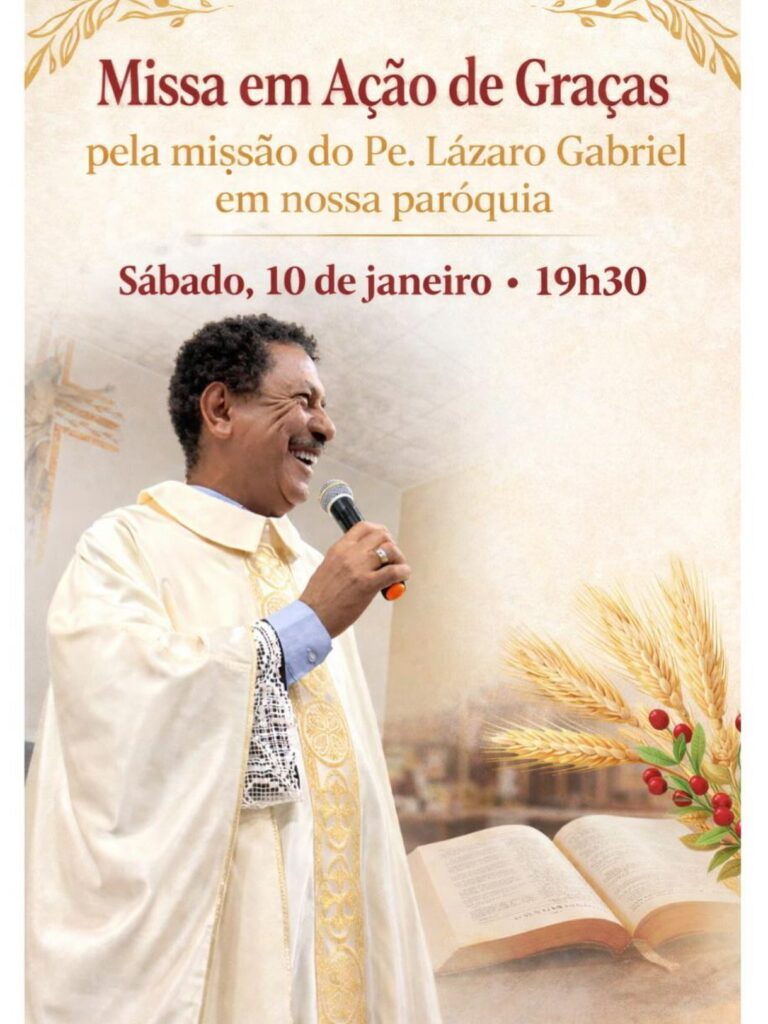 “Agradecemos a Deus pelo tempo, pela dedicação e pela missão do Pe. Lázaro Gabriel em nossa paróquia. Vamos nos unir em oração por seus novos caminhos e convidamos toda a comunidade para este momento especial de agradecimento”, escreveu a paróquia em rede social.