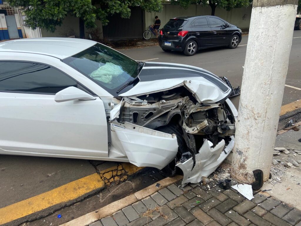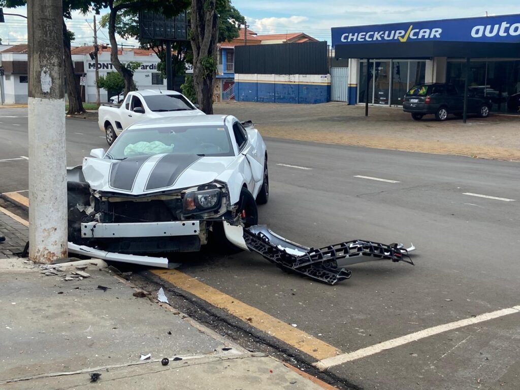 Motorista perde controle e colide Camaro em poste no centro de Artur Nogueira