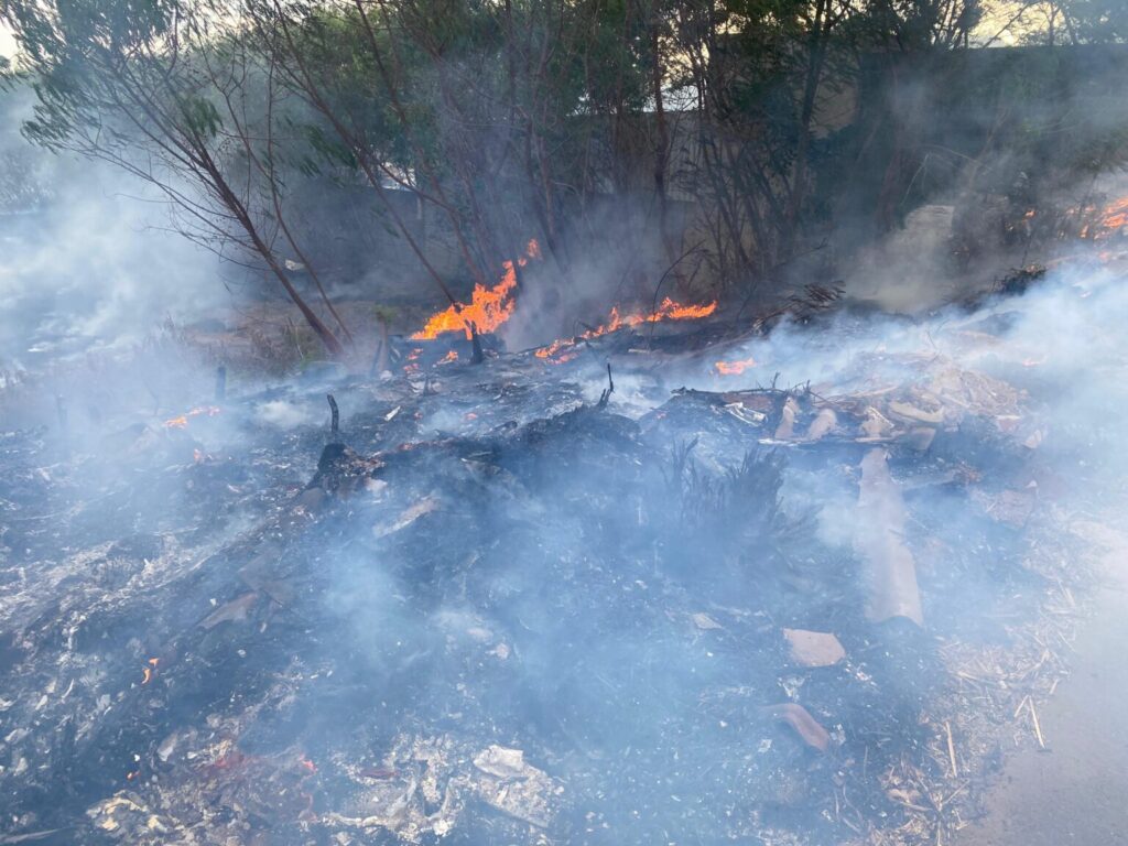 Em caso de fogo, a recomendação é manter distância segura e não tentar apagar sozinho, já que o fogo pode se espalhar rapidamente. A população deve acionar imediatamente a Defesa Civil pelo 153 ou o Corpo de Bombeiros pelo 193.