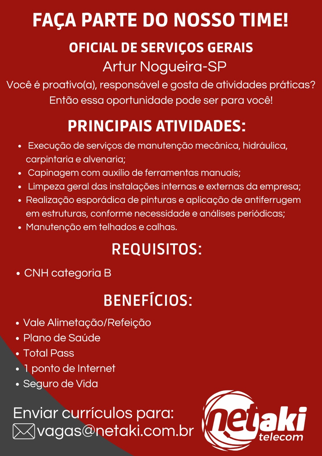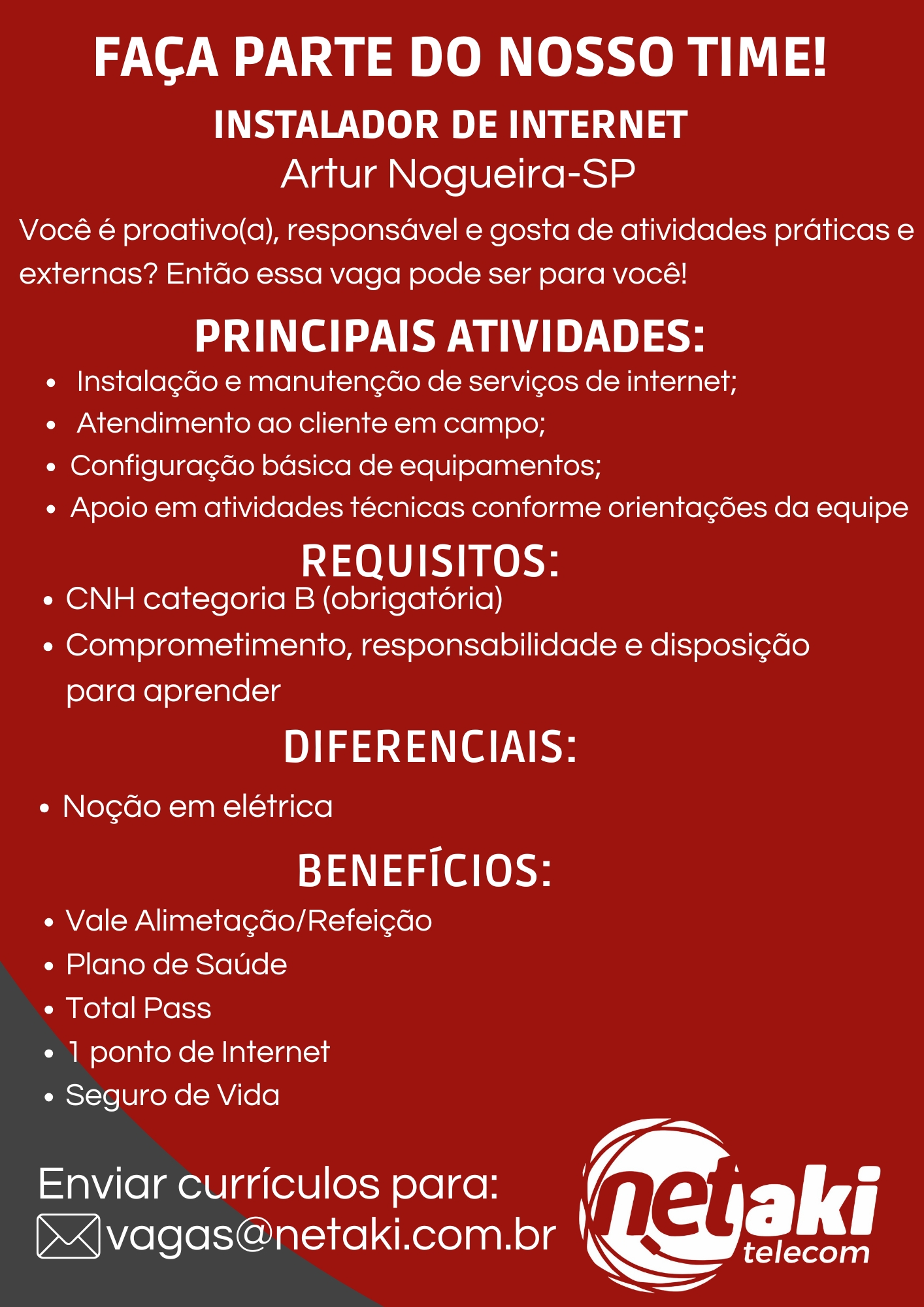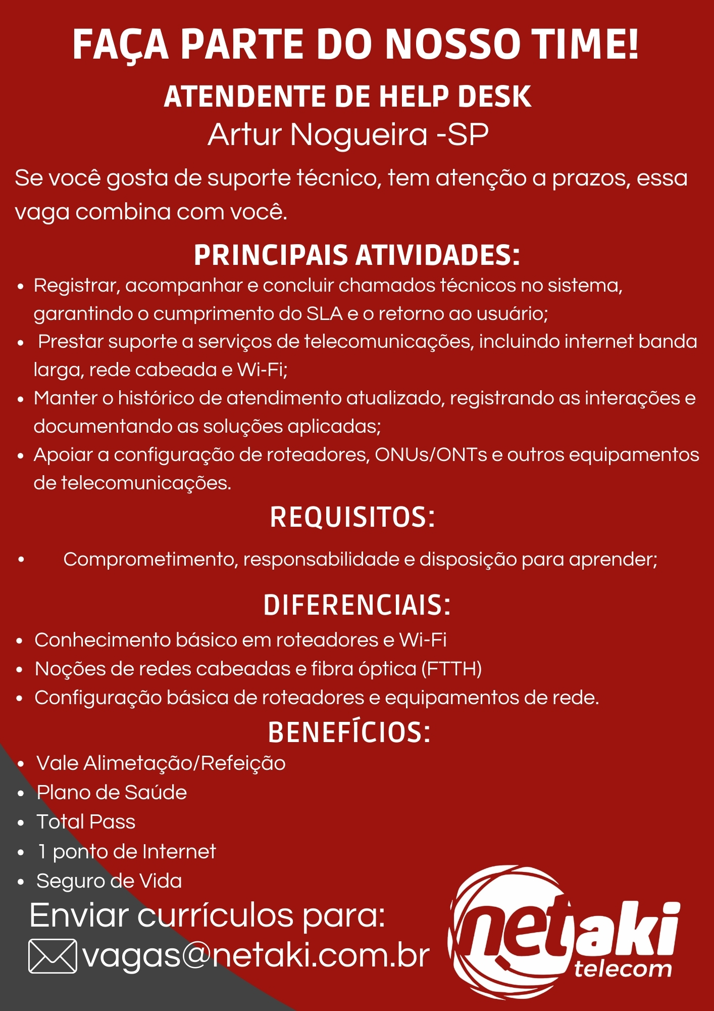 Se você é proativo e busca uma oportunidade no setor de tecnologia, a NetAki Telecom está com vagas abertas para integrar sua equipe em Artur Nogueira. Confira as oportunidades disponíveis e os benefícios de ser um colaborador: