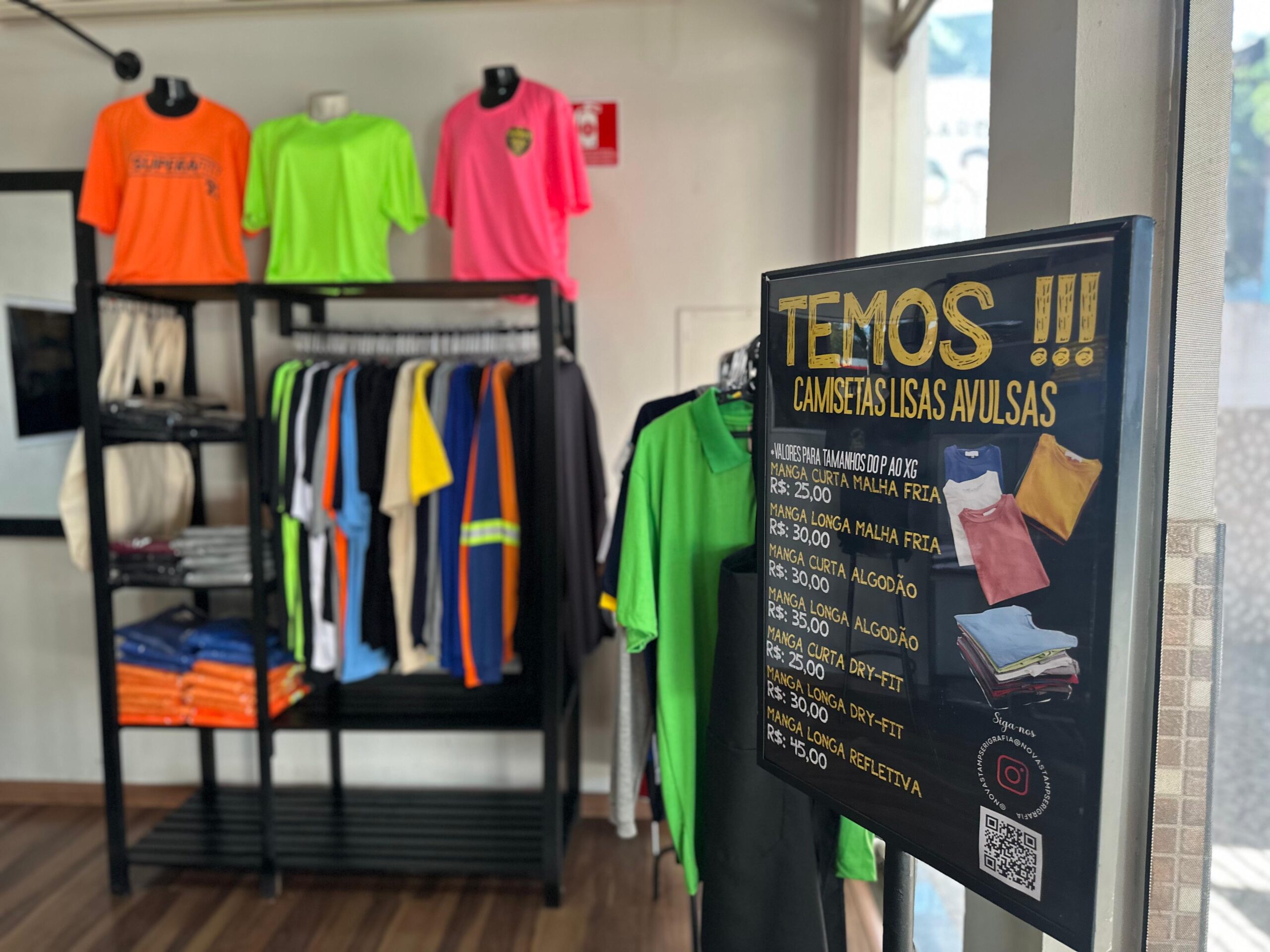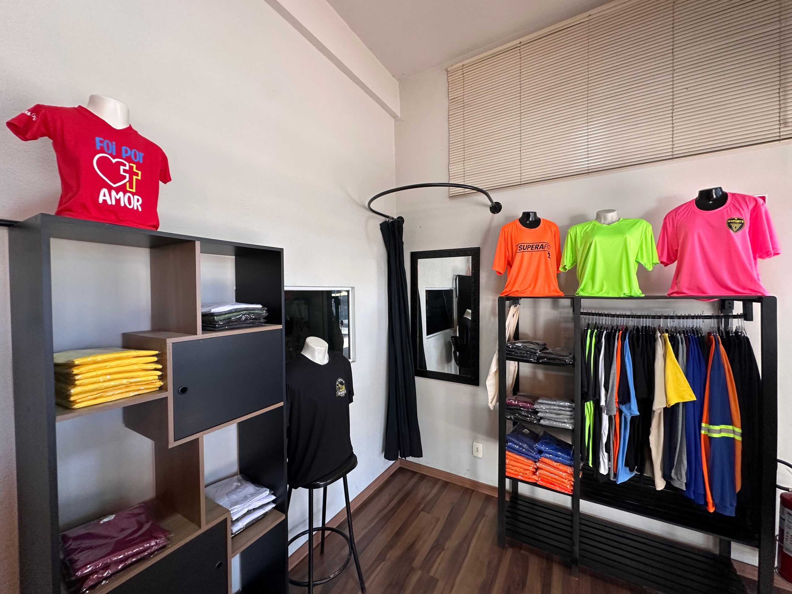 A Nova Stamp produz camisetas personalizadas desde a escolha do tecido até a confecção, com corte terceirizado e estamparia feita no próprio local.