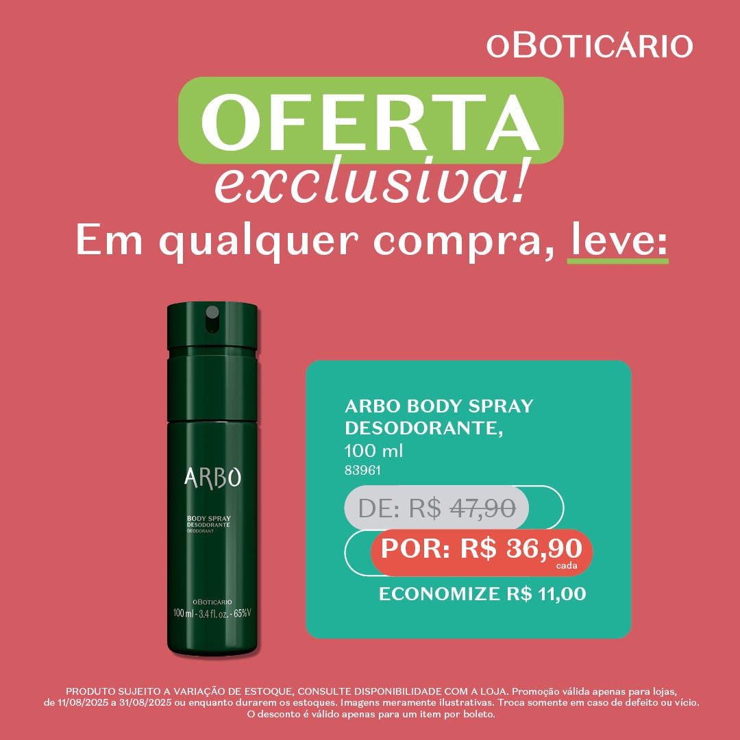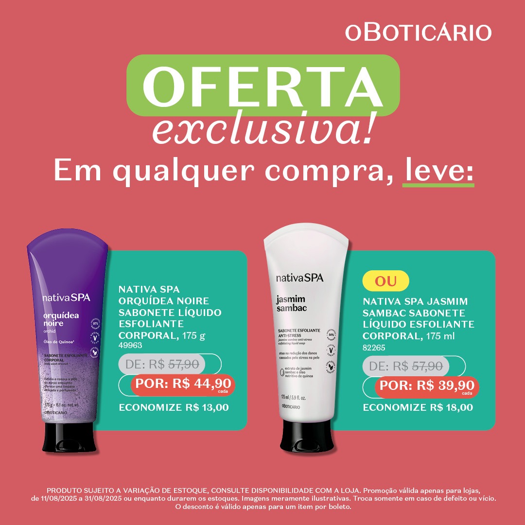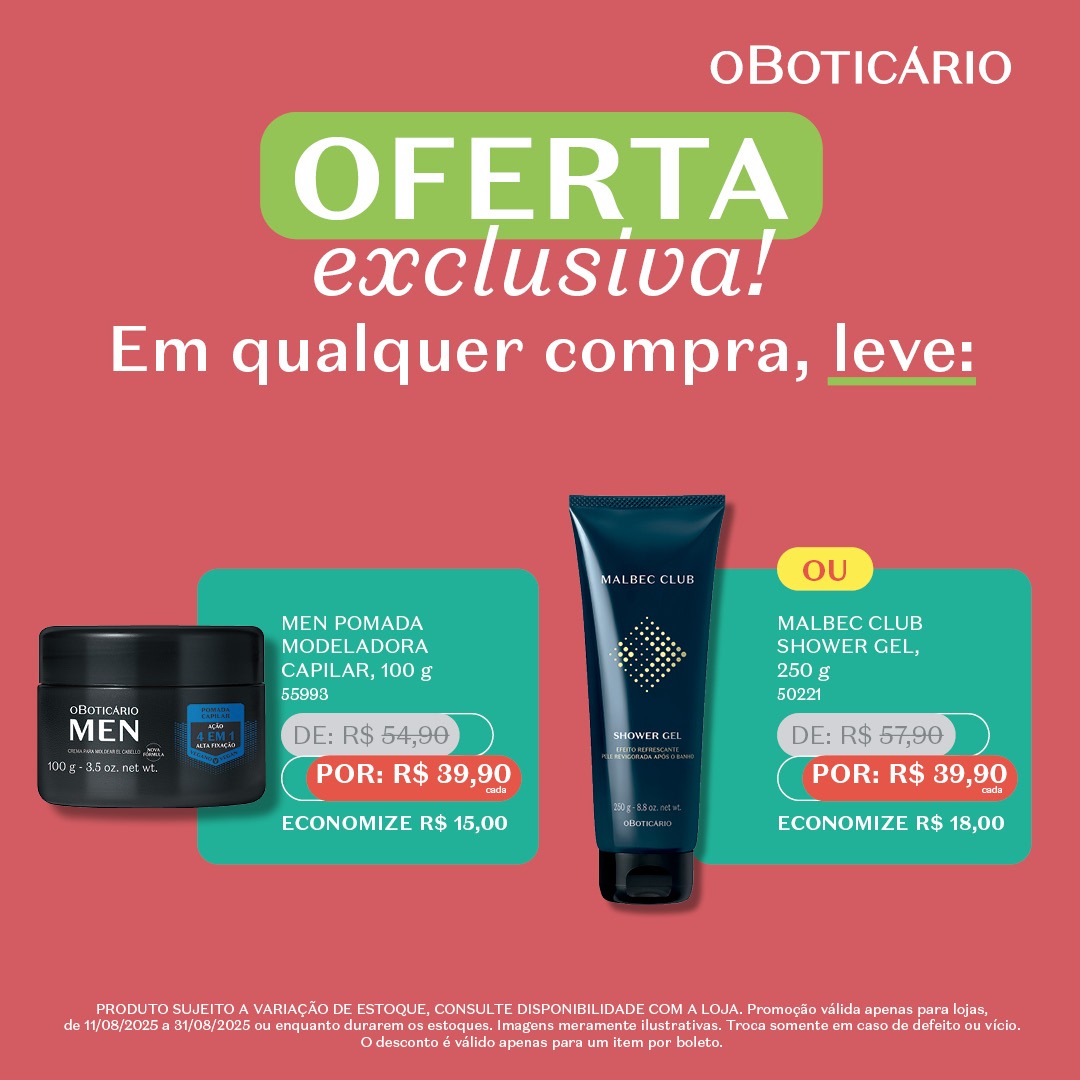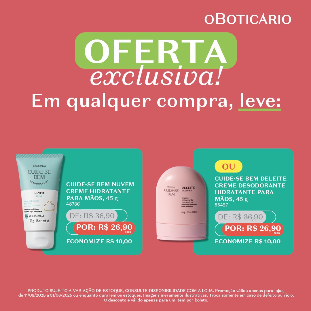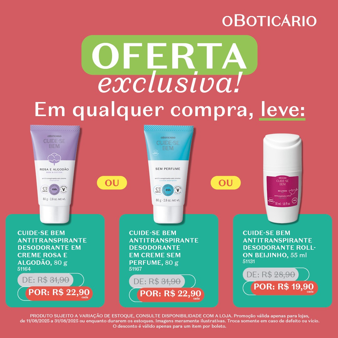 A seleção da promoção inclui linhas queridinhas como Cuide-se Bem, Nativa SPA, Malbec e Arbo, conhecidas pela qualidade, fragrâncias irresistíveis e cuidados completos para o corpo, cabelos e pele. Há opções para todos os gostos e necessidades: desodorantes, hidratantes, sabonetes esfoliantes, pomadas modeladoras e body sprays, todos com preços reduzidos especialmente para a ação.