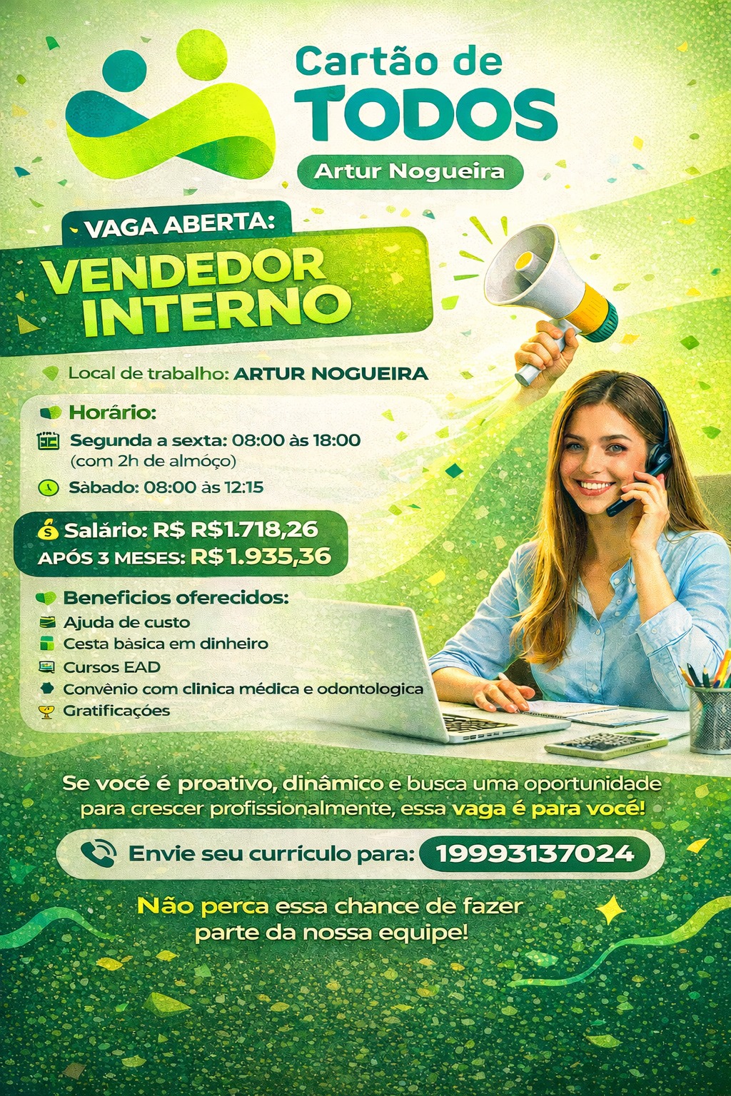 Oportunidade em Artur Nogueira: Cartão de TODOS abre vaga para Vendedor Interno