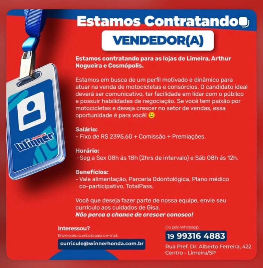 A Winner Honda anunciou a abertura de novas vagas para o cargo de Vendedor(a) para suas unidades em Artur Nogueira, Limeira e Cosmópolis. A empresa busca profissionais motivados, comunicativos e que possuam facilidade no trato com o público e habilidades de negociação. Se você tem paixão pelo mundo das duas rodas e deseja crescer na área de vendas, esta é a oportunidade ideal.