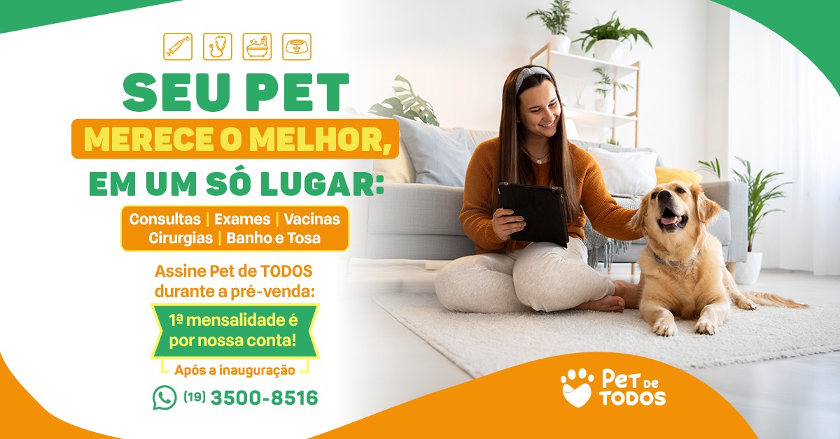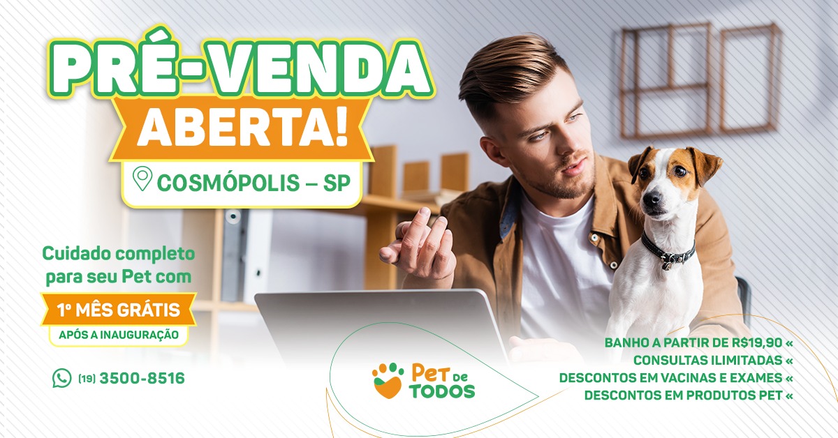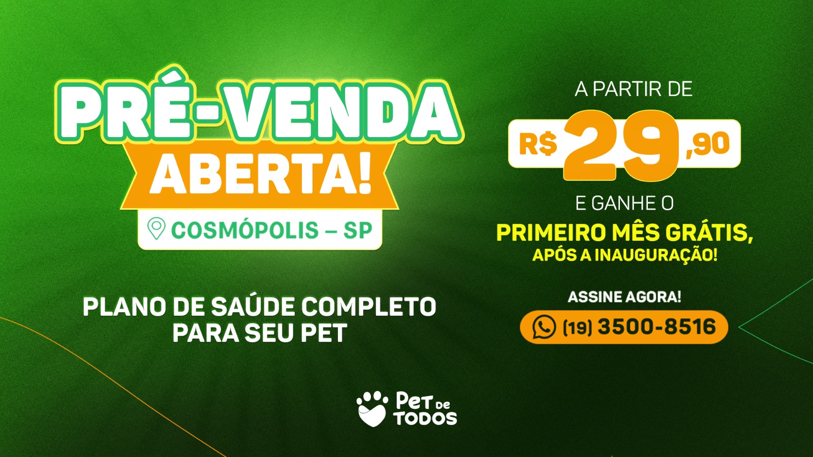 A família cresceu e o cuidado agora se estende aos seus melhores amigos com o lançamento do Pet de Todos. Para celebrar a chegada deste novo projeto, a unidade de Cosmópolis preparou uma oferta exclusiva de pré-venda: ao aderir agora, o cliente garante a adesão e ganha o primeiro mês de mensalidade grátis logo após a abertura oficial da unidade. É a oportunidade perfeita para planejar a saúde do seu pet com condições que facilitam o seu bolso.