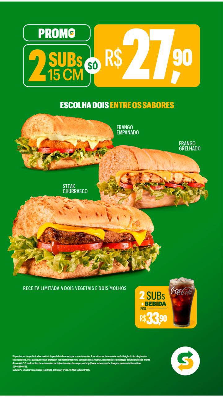 Se a ideia é comer bem, gastar menos e ainda escolher sabores que agradam, essa é a hora. Passe no Subway, aproveite a promoção dos dois subs por R$ 27,90 e transforme sua refeição em uma escolha inteligente e saborosa.