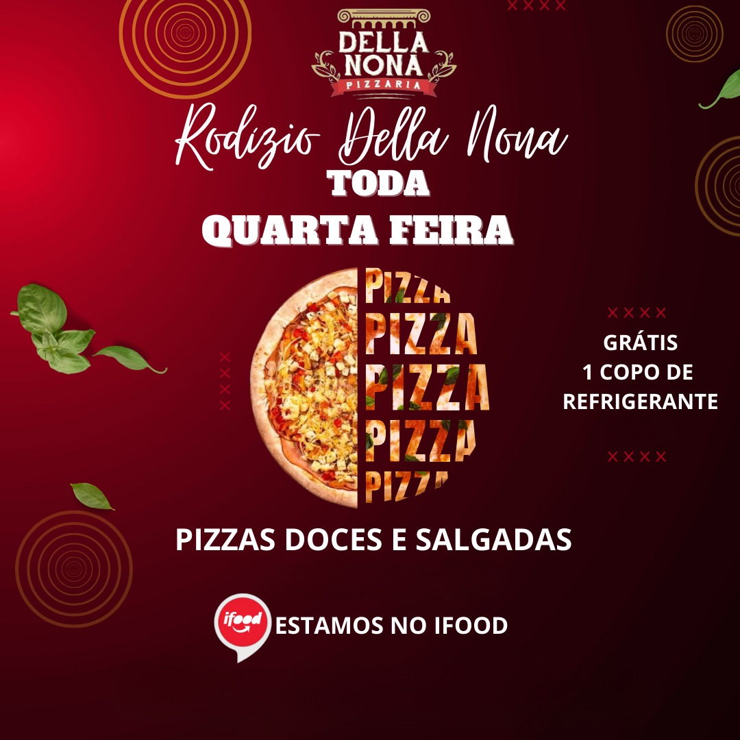 Hoje é dia de saborear mais de 60 sabores incríveis no rodízio da Della Nona Pizzaria! Com massa caseira e recheios irresistíveis, você e sua família vão se deliciar com opções que vão dos clássicos como frango com requeijão, portuguesa e muito queijo, até as doces, como a saborosa opção de chocolate. E o melhor: por apenas R$ 46,90, você ainda ganha um super copo de refrigerante para acompanhar.