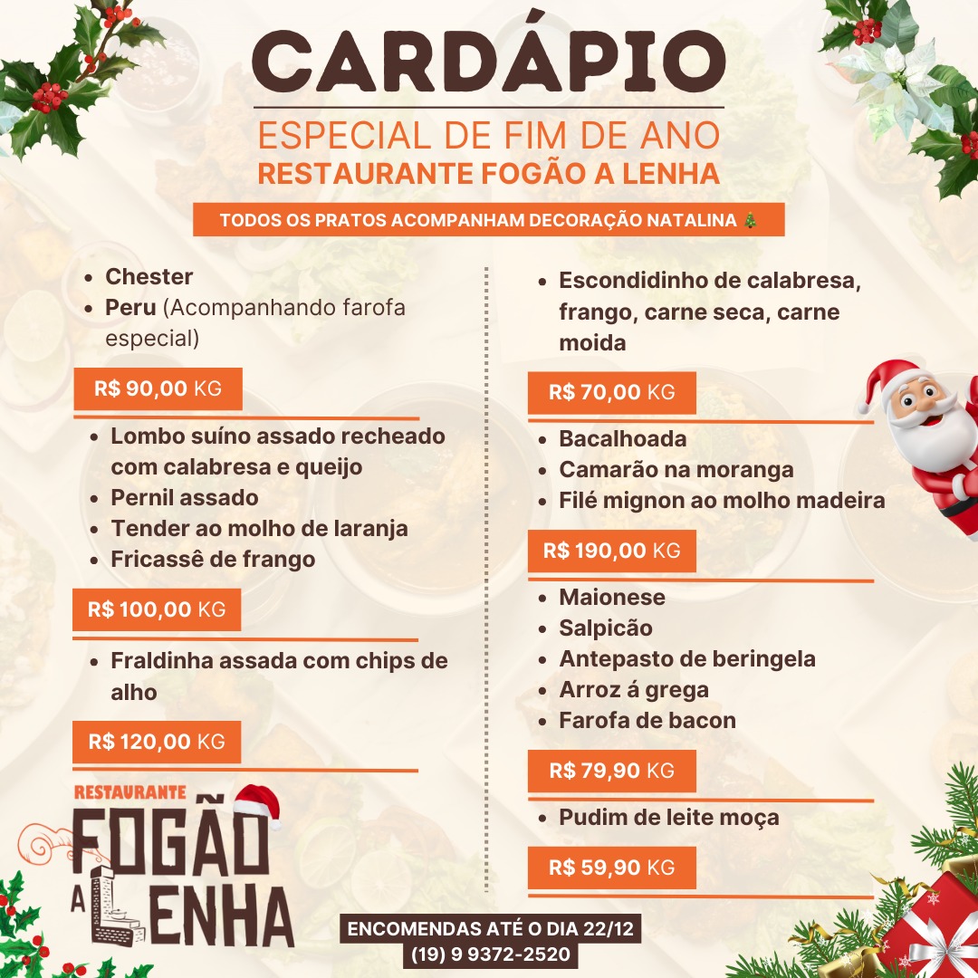 As festas de fim de ano estão chegando, e nada melhor do que reunir a família e amigos em torno de uma ceia farta e deliciosa. Para tornar sua celebração ainda mais especial, o Restaurante Fogão a Lenha, conhecido por seus pratos tradicionais e irresistíveis, apresenta seu Cardápio de Natal, elaborado pela renomada Chef Ana Prado.
