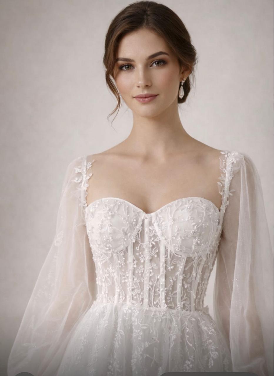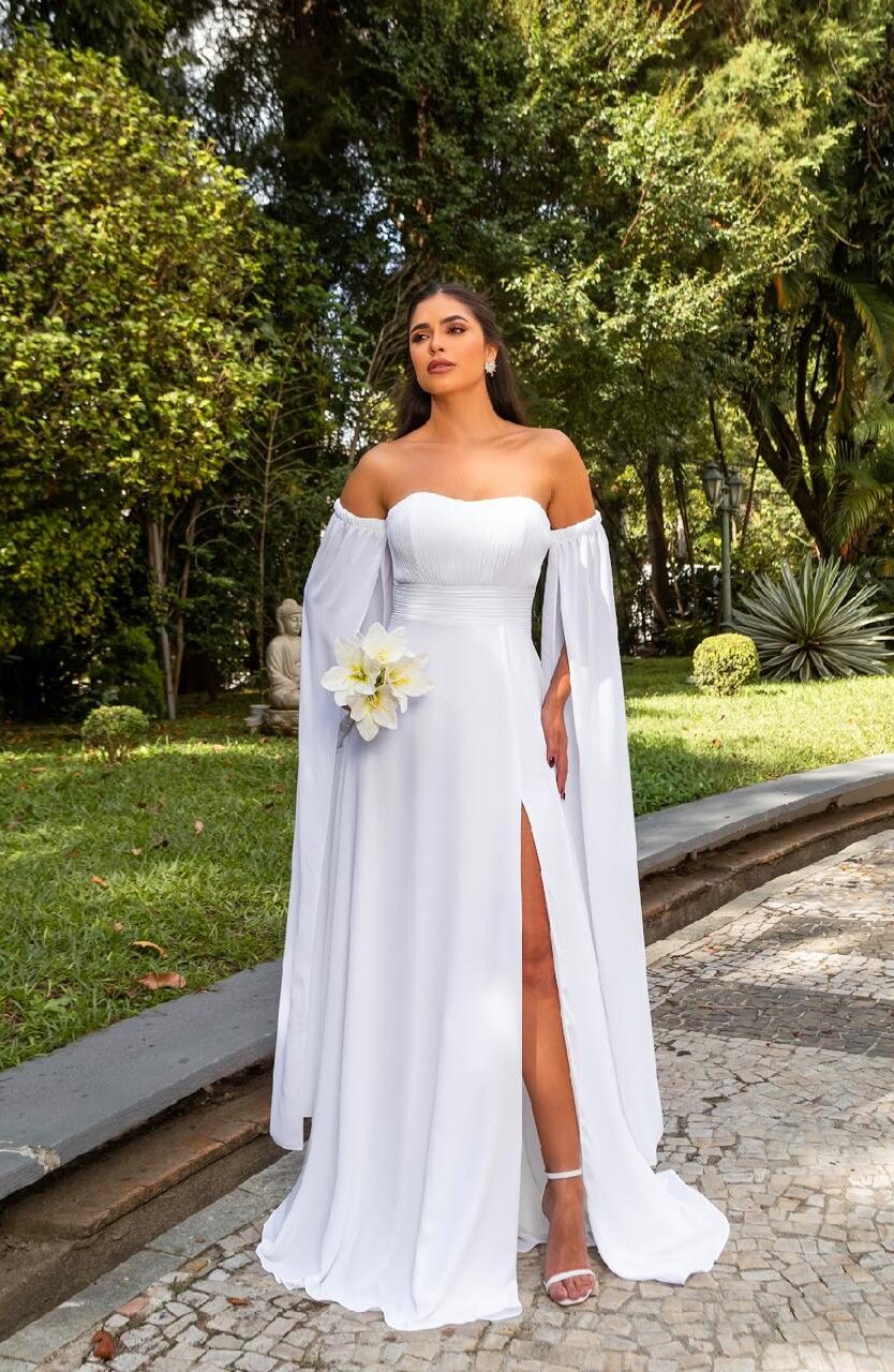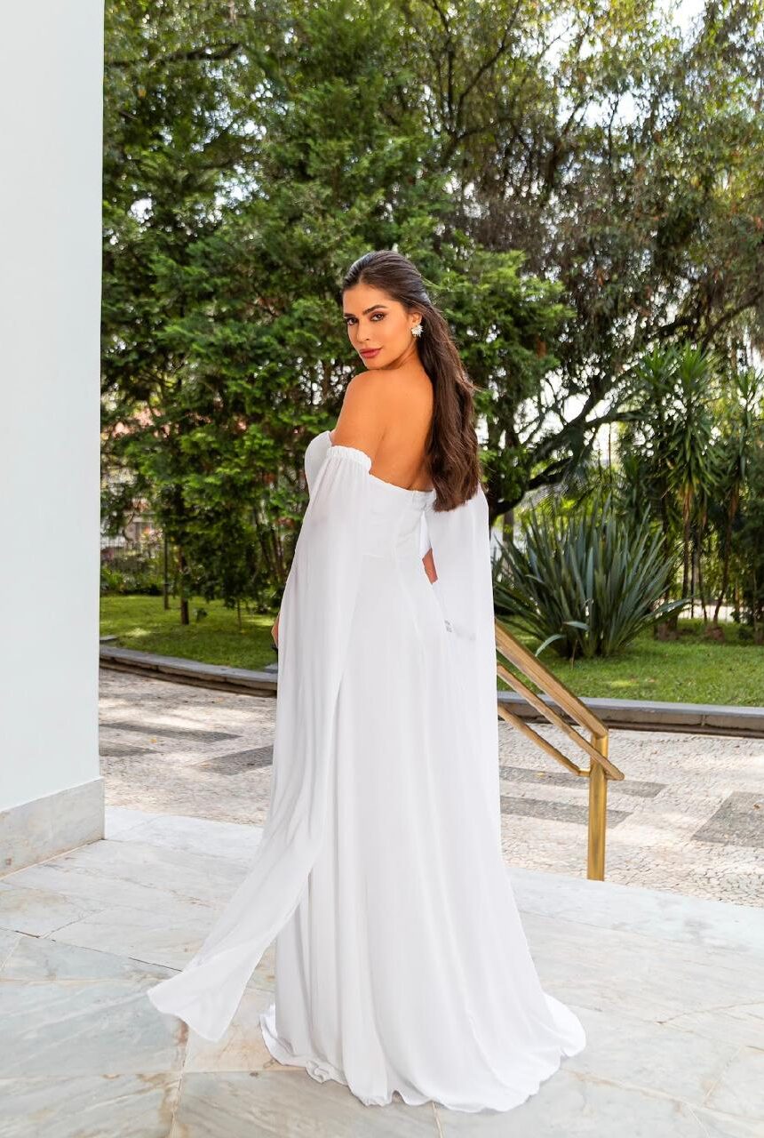 As mangas, sejam bufantes, levemente drapeadas ou em tule com aplicações, dão um charme extra ao visual nupcial, trazendo um ar clássico e impactante.