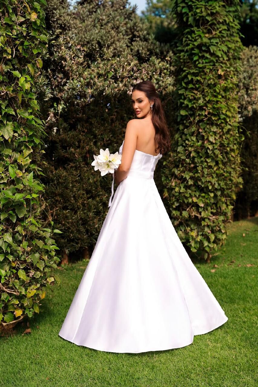 Vestidos com linhas limpas, tecidos fluidos e corte impecável ganham destaque. A simplicidade elegante é a nova tendência para casamentos ao ar livre, na praia ou no campo, perfeitos para quem busca sofisticação sem exageros.