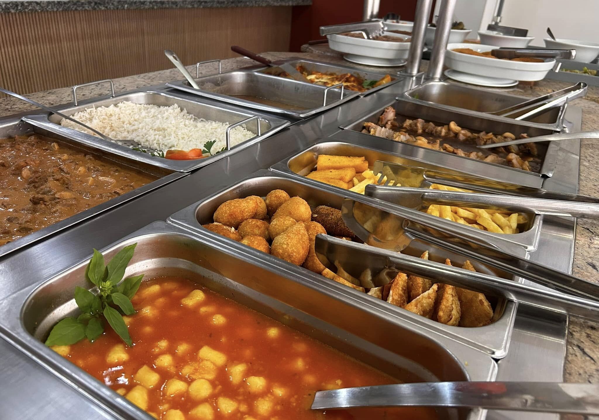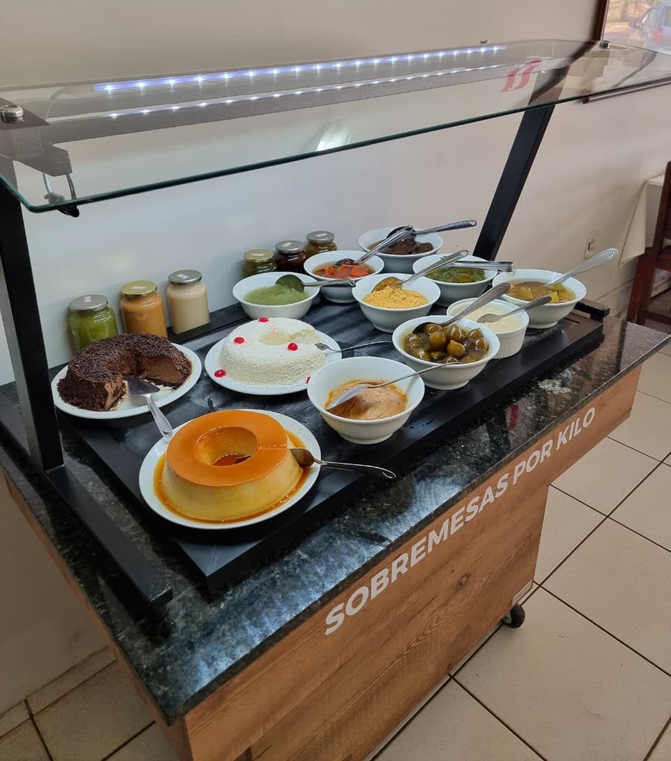 O cardápio é elaborado para agradar todos os gostos: o buffet inclui massas, saladas frescas, pratos quentes, opções frias e 10 variedades de sobremesas irresistíveis. Você pode escolher entre o self-service por quilo ou à vontade.