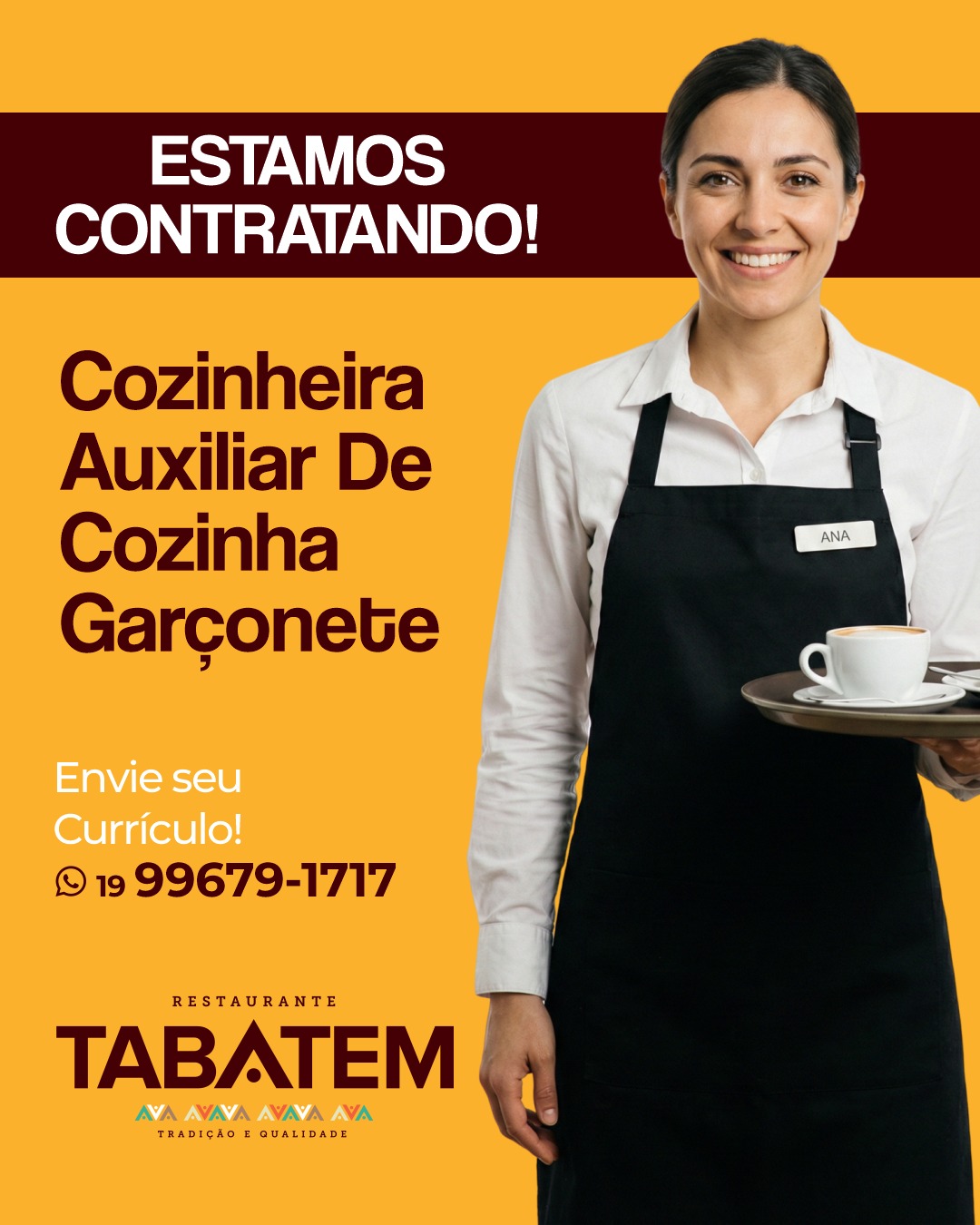 Tabatém abre vagas para Cozinheira, Auxiliar de Cozinha e Garçonete
