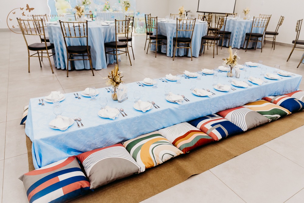 Falando nas comidinhas, não são poucas as opções. Seus convidados vão se deliciar com cachorros quentes, salgadinhos, batatas fritas, pipoca e muito mais, chega a dar água na boca, não é mesmo? As mesas estarão todas decoradas e equipadas com pratos, talheres, toalhas e copos de qualidade, você não vai precisar se preocupar com nada.
