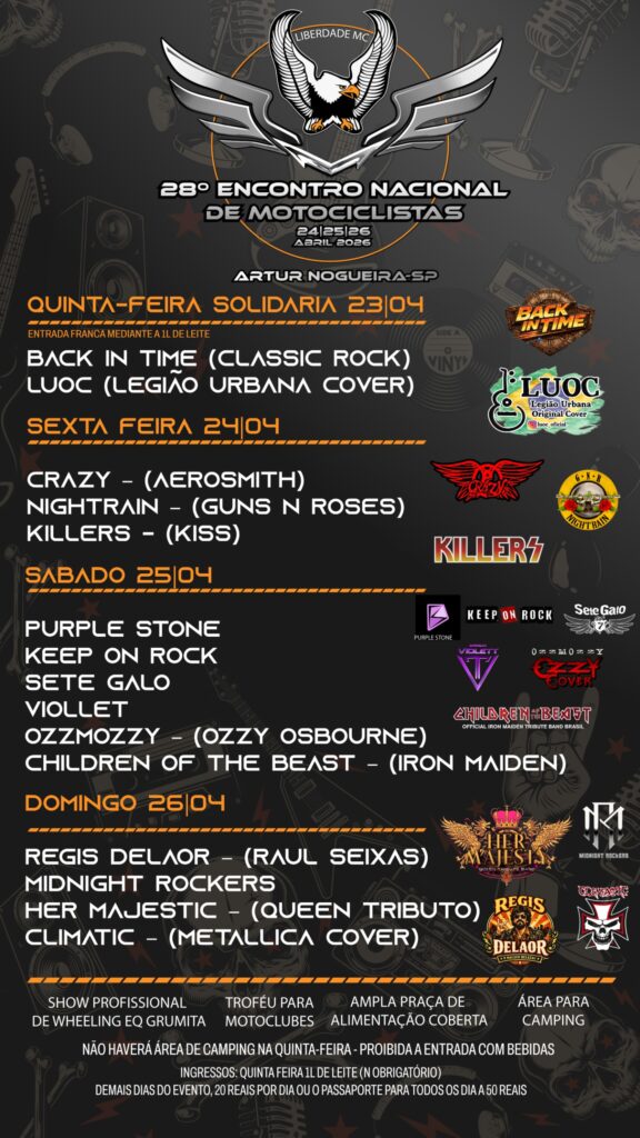 Está chegando um dos eventos mais aguardados de Artur Nogueira e de toda a região. Todos os anos, a festa reúne milhares de pessoas em busca de bom rock’n’roll e momentos de diversão ao lado da família e dos amigos. A programação começa nesta quinta-feira (23) e segue até domingo (26), com o 28º Encontro Nacional de Motociclistas, um dos mais tradicionais do interior paulista.