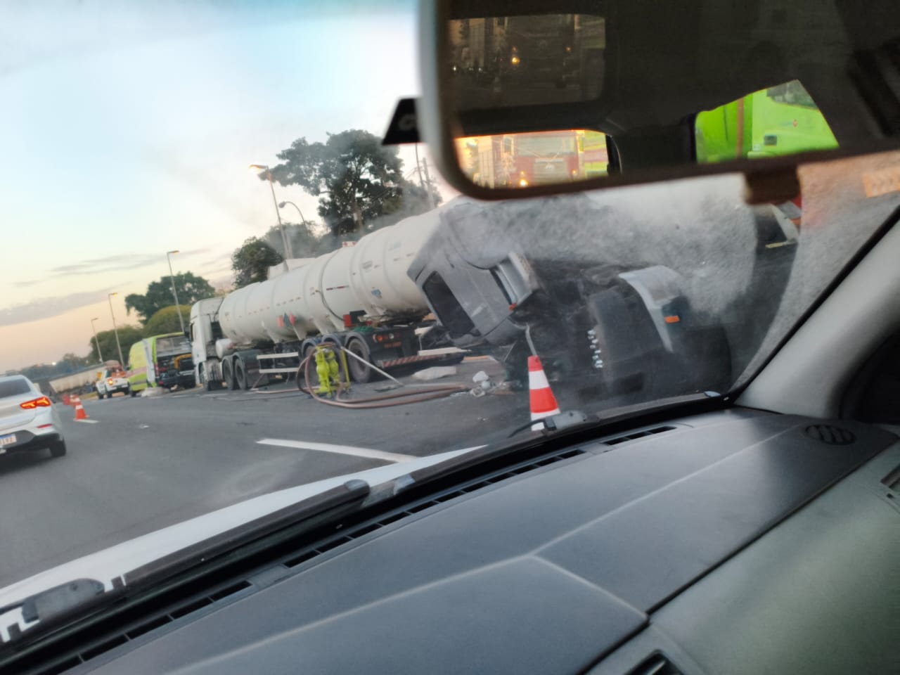 Faixa Norte da rodovia Professor Zeferino Vaz, em Paulínia no sentido Cosmópolis, ficou comprometida; equipes do Corpo de Bombeiros, Cetesb e Rota das Bandeiras atuam no local