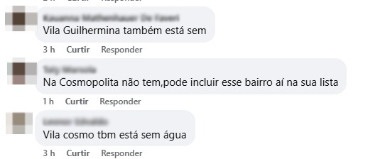 Nas redes sociais, moradores do município reclamaram a falta de abastecimento e alegaram que outros bairros também foram afetados, como Vila Guilhermina, Jardim Cosmopolita e Vila Cosmo. Veja os relatos a seguir: