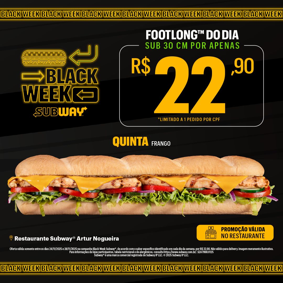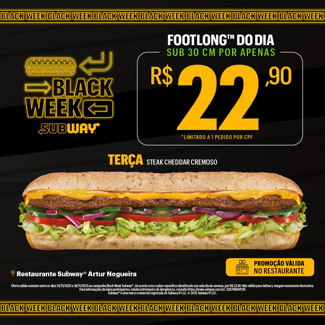 Combinando variedade, praticidade e preços reduzidos, a Black Week do Subway se torna uma ótima oportunidade para garantir refeições saborosas sem pesar no orçamento. Basta escolher o dia, o sabor e passar na unidade mais próxima para aproveitar.