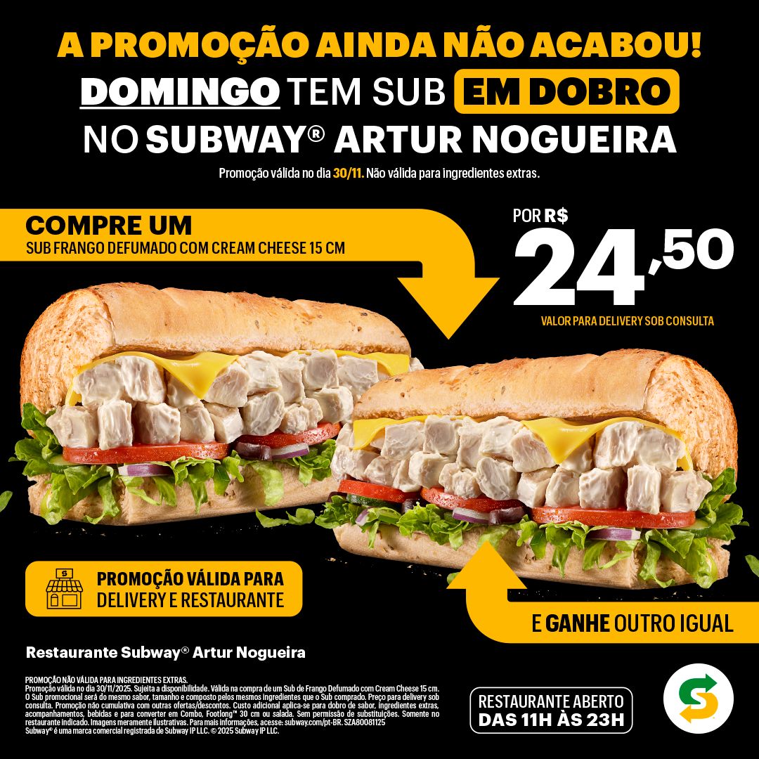 Encerrando a Black Week, o domingo 30/11 chega com uma oferta adicional: o Sub de 15 cm de Frango Defumado com Cream Cheese entra em formato pague 1 e leve 2 por R$ 24,50. Uma oportunidade ideal para saborear seu lanche favorito gastando menos ou dividir com alguém.