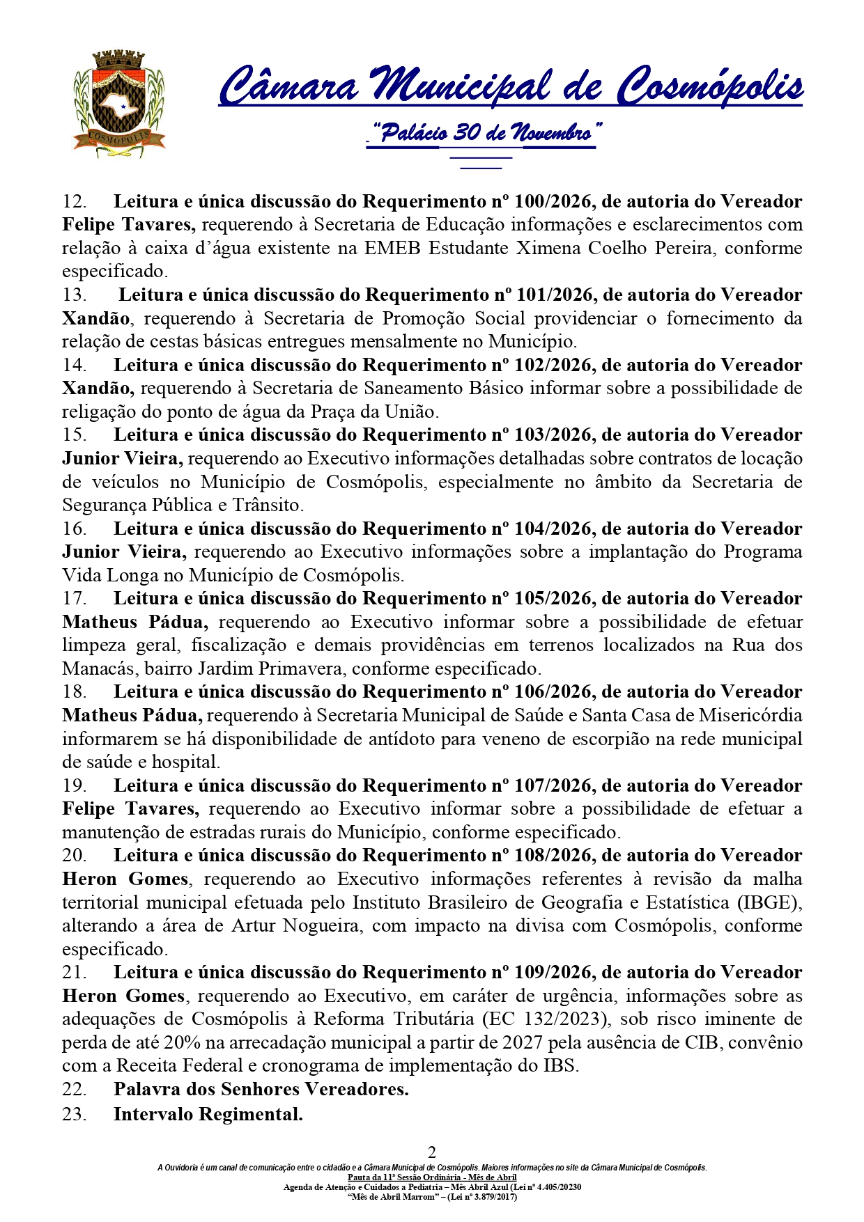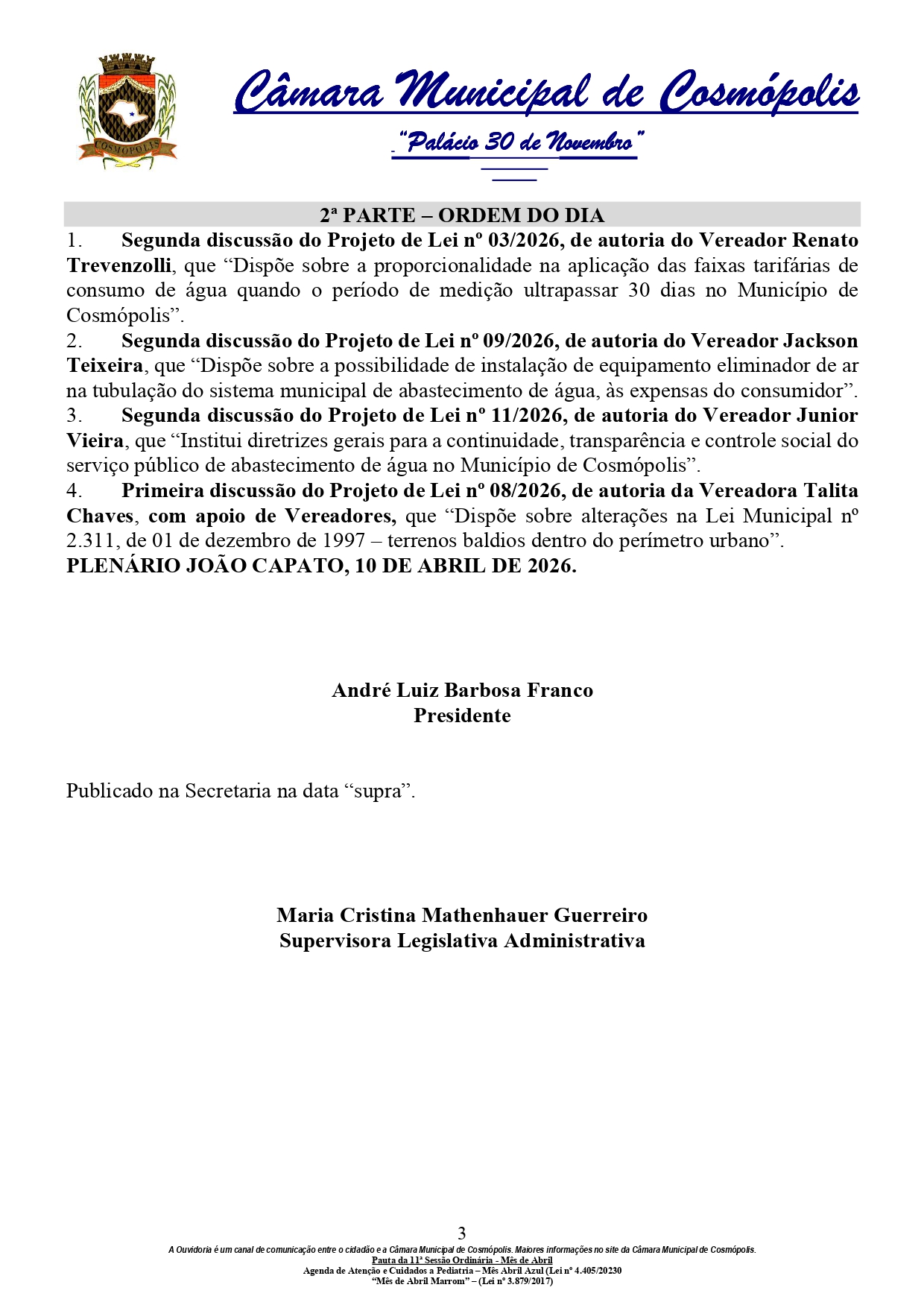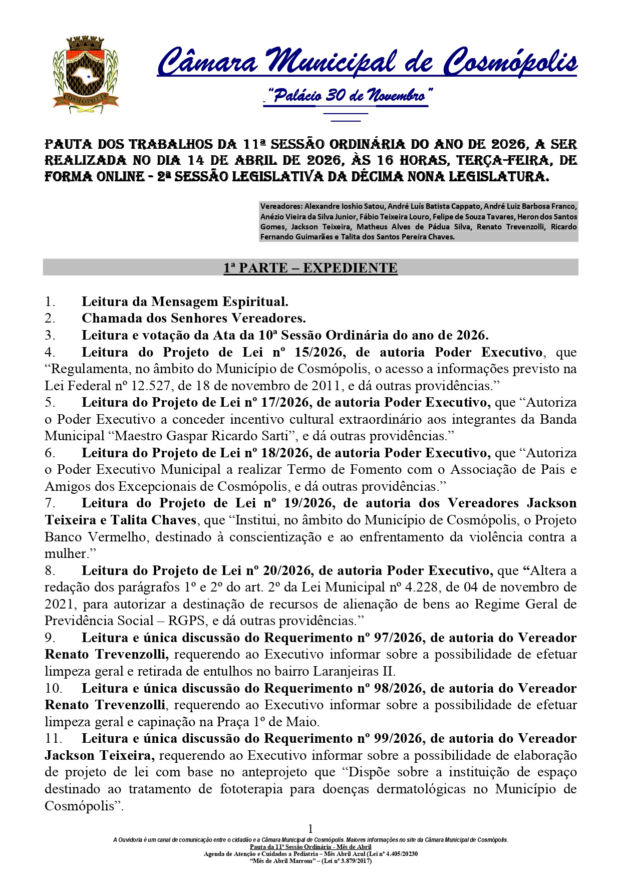 A Câmara Municipal de Cosmópolis realiza, nesta terça-feira (14), a 10ª Sessão Ordinária de 2026. A reunião dos vereadores está marcada para as 16h e ocorrerá em formato on-line, com transmissão ao vivo pelo site camaracosmopolis.sp.gov.br/.