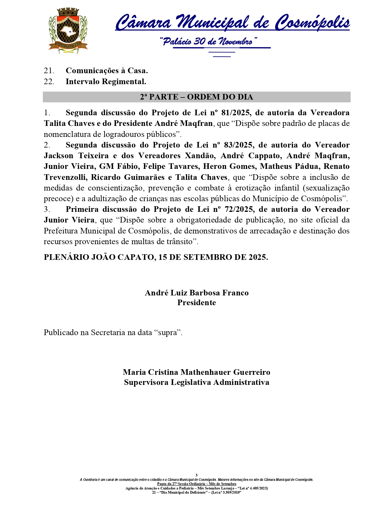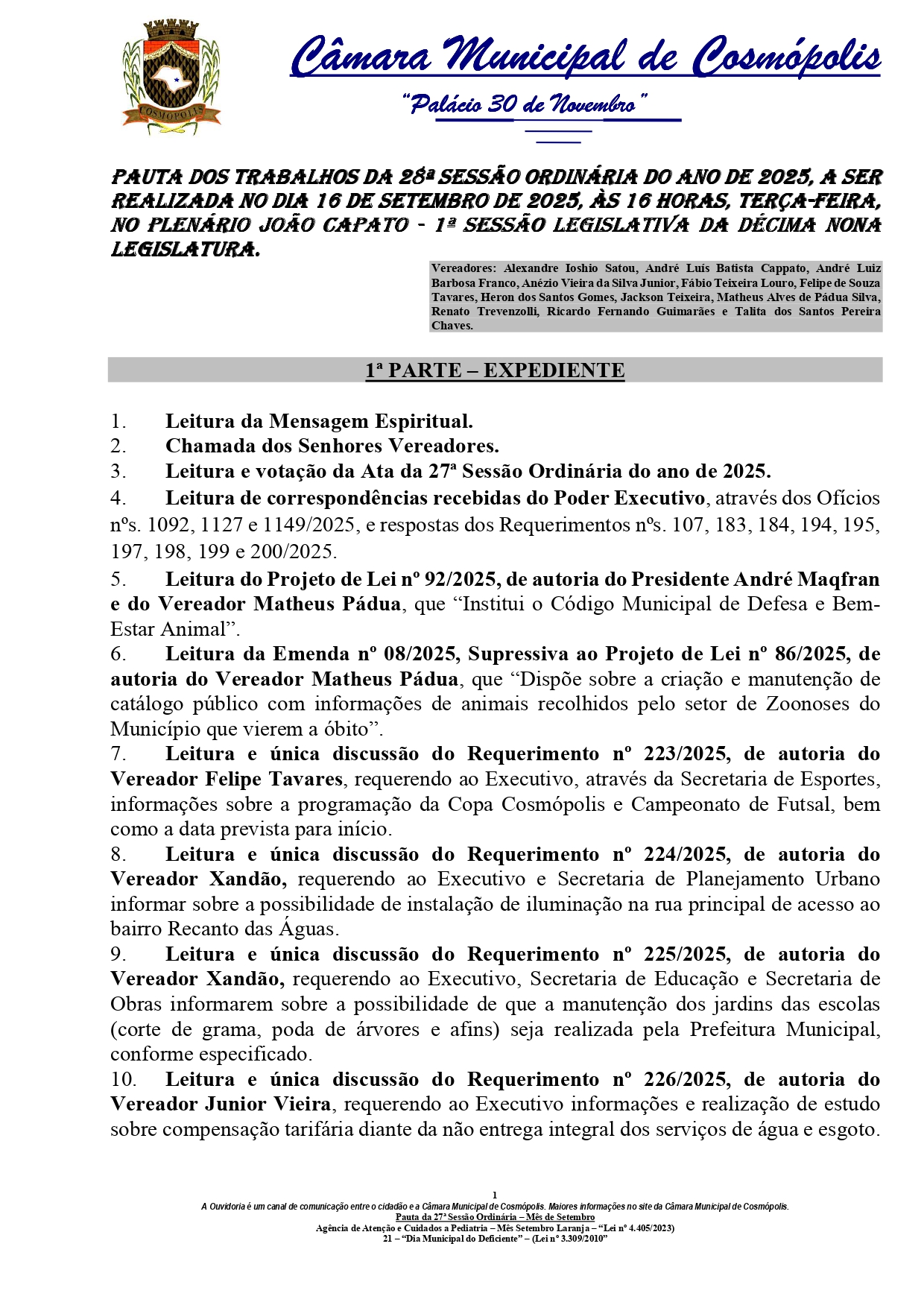 A Câmara de Cosmópolis realiza nesta terça-feira (16) a 28ª Sessão Ordinária de 2025. O encontro dos vereadores acontece a partir das 16h, no Plenário João Capato, e é aberto ao público.