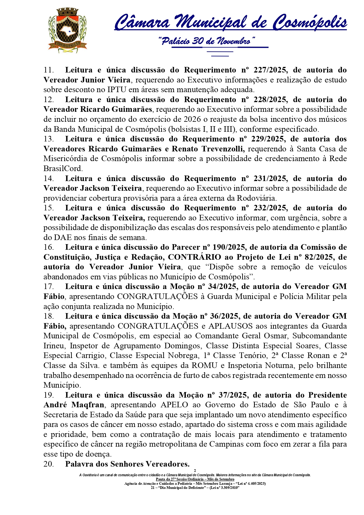 A sessão irá tratar de propostas ligadas ao bem-estar animal, manutenção de escolas, iluminação pública, esportes, saúde e transparência. Também serão discutidas a compensação por falhas nos serviços de água e esgoto, desconto no IPTU, reajuste das bolsas da banda municipal, melhorias no atendimento a pacientes com câncer e moções de reconhecimento à Guarda Municipal e à Polícia Militar.