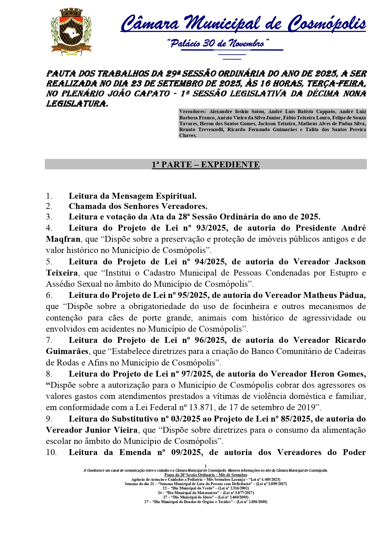 Os vereadores também discutirão projetos de lei como a criação do Banco Comunitário de Cadeiras de Rodas, diretrizes para o consumo da alimentação escolar e regras para o uso de focinheiras e outros mecanismos de contenção para cães de grande porte ou com histórico de agressividade.