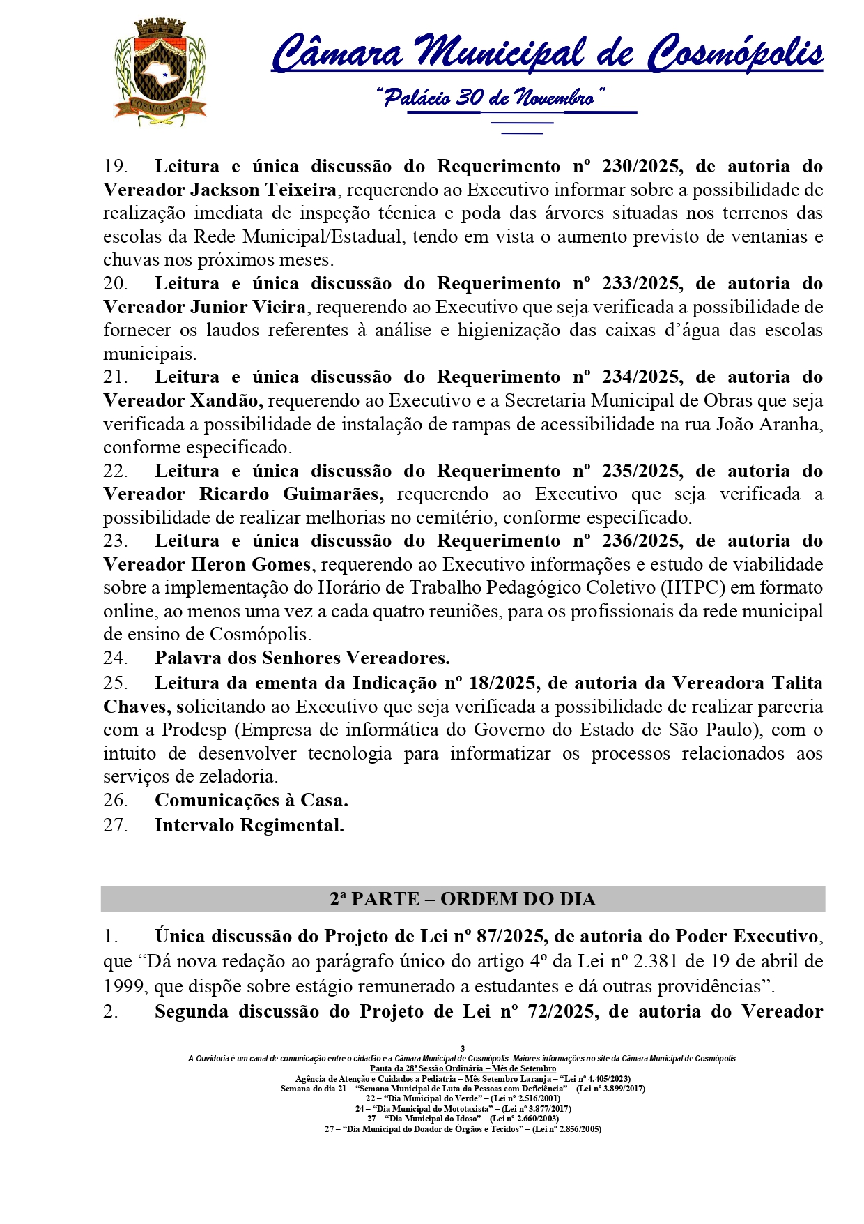 Além disso, a sessão contará com a análise de requerimentos relacionados à manutenção pública, acessibilidade e educação.