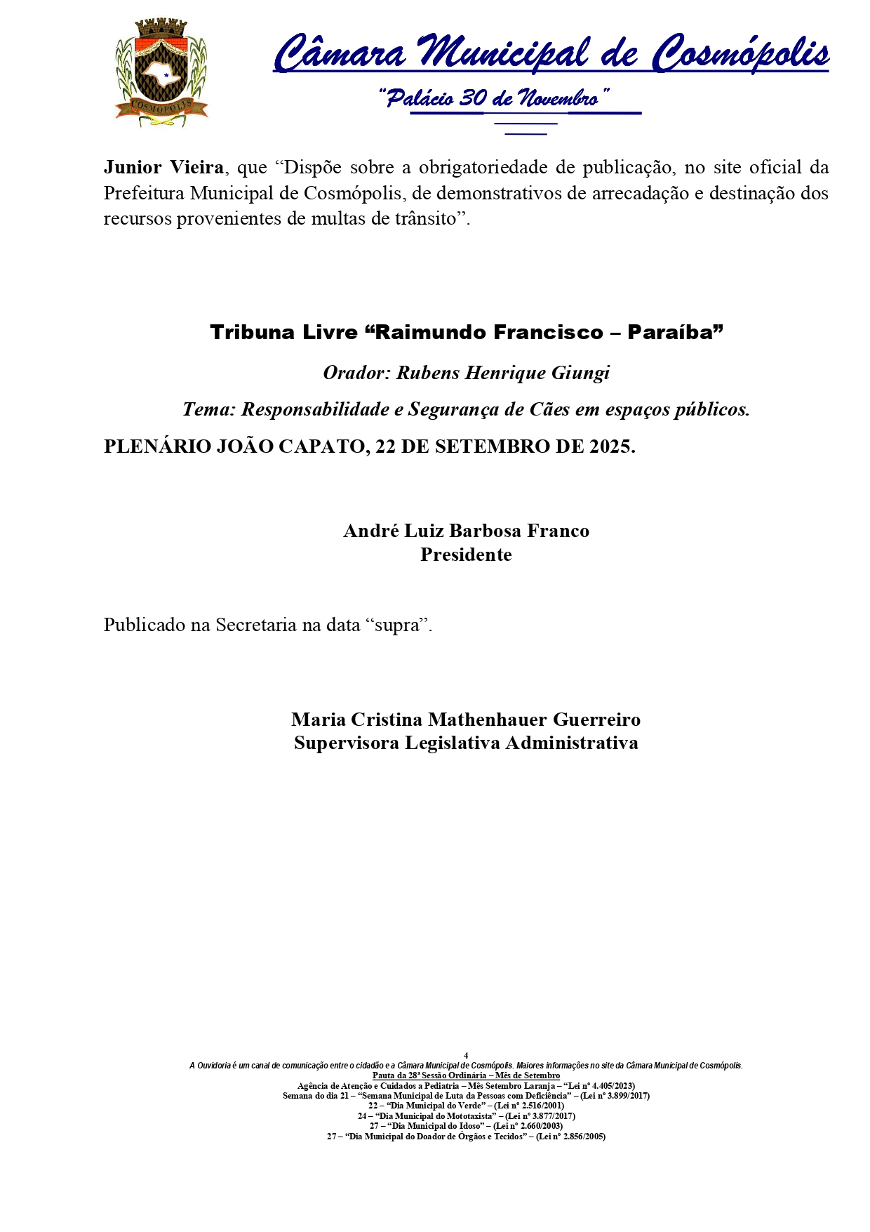 Entre os assuntos em pauta estão propostas ligadas à causa animal, incluindo o uso da Tribuna Livre pelo orador Rubens Henrique Giungi, que abordará o tema “Responsabilidade e Segurança de Cães em Espaços Públicos”.